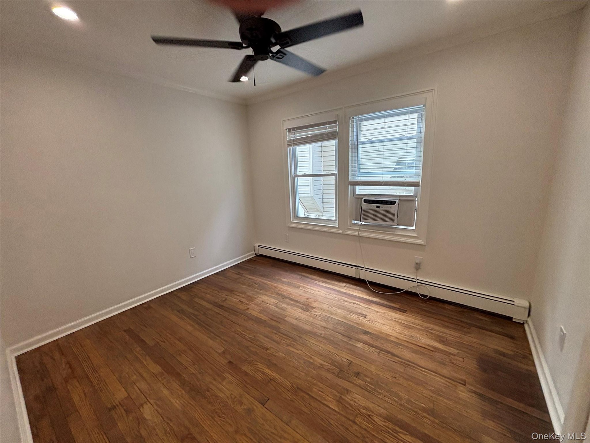- Empty room featuring wood finished floors, a baseboard radiator, a ceiling fan, and ornamental molding