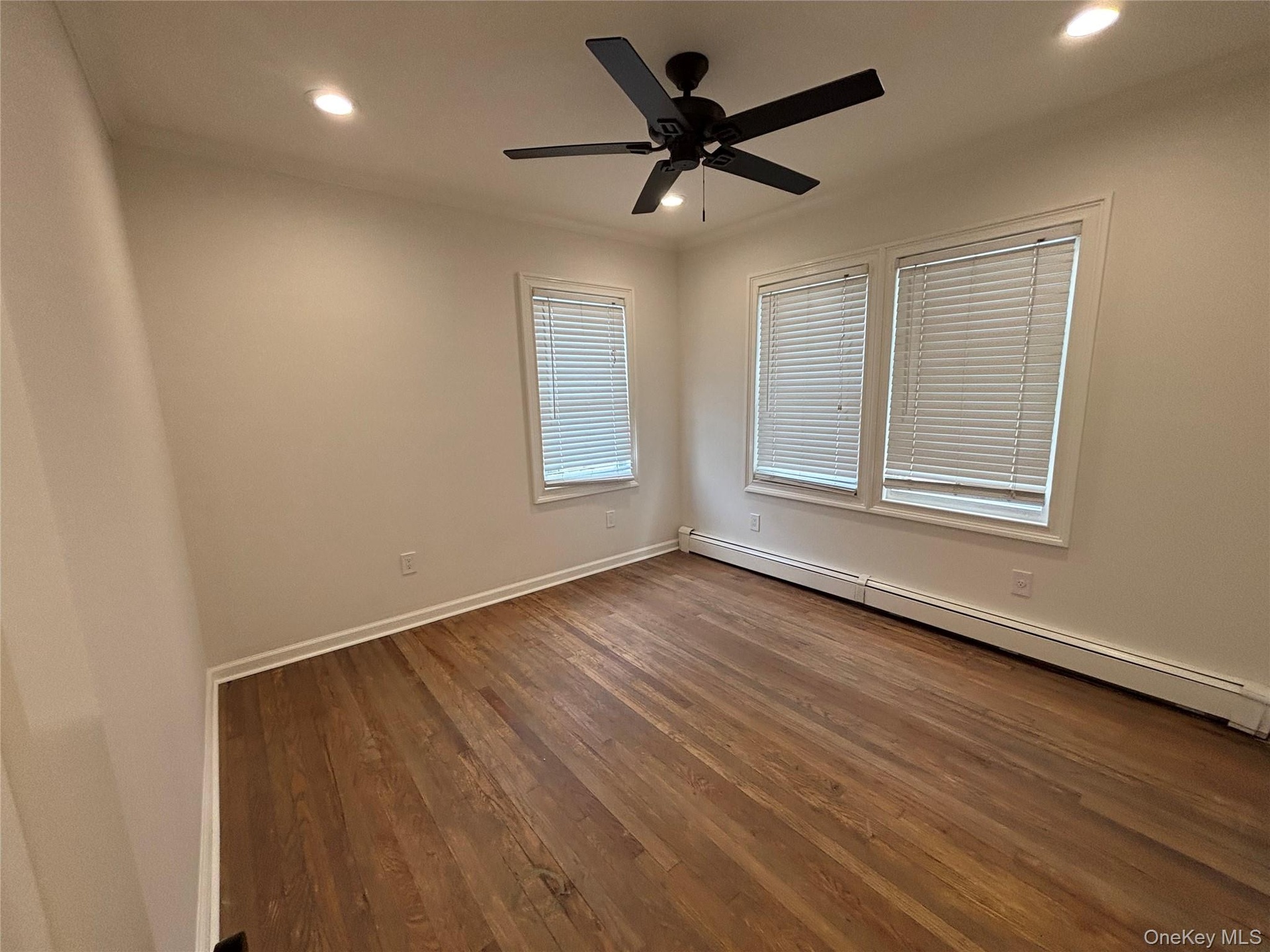 - Spare room with baseboard heating, dark wood-style flooring, recessed lighting, a ceiling fan, and ornamental molding