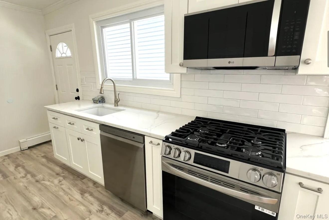 - Kitchen with appliances with stainless steel finishes, white cabinetry, light stone countertops, decorative backsplash, and light wood finished floors