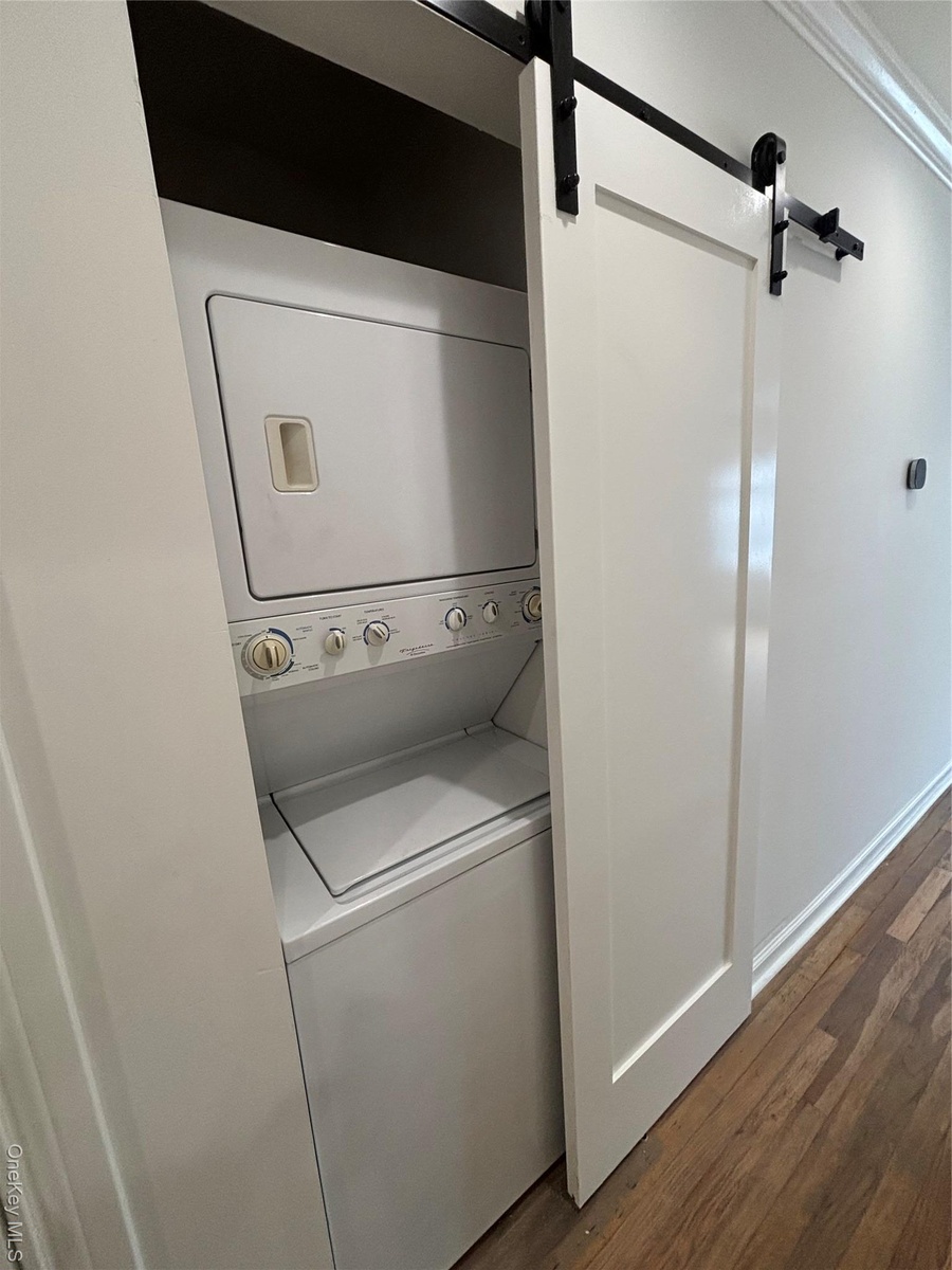 - Laundry area with stacked washing machine and dryer, a barn door, and wood finished floors
