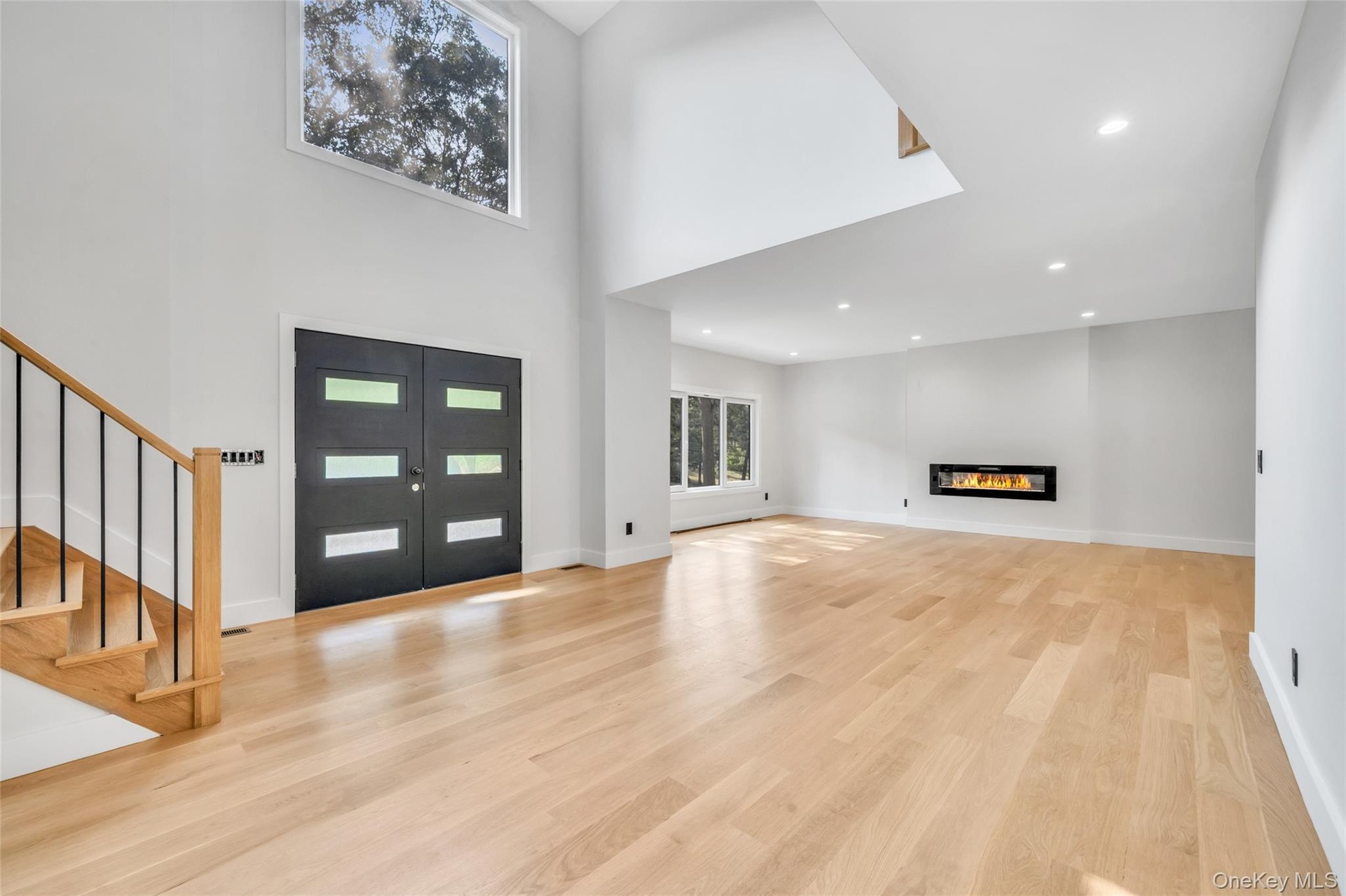 - Unfurnished living room with recessed lighting, a high ceiling, light wood-style floors, and stairway