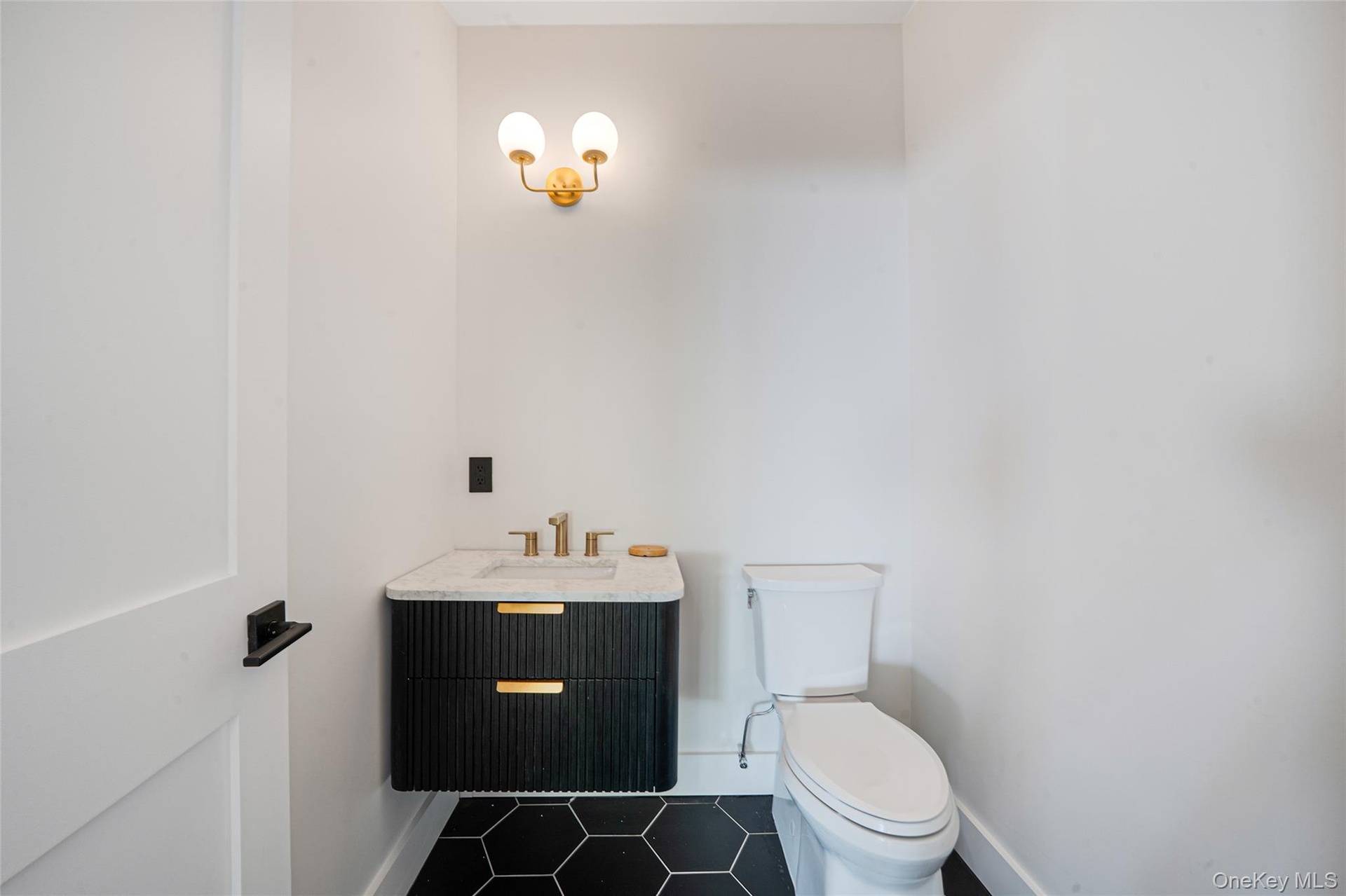 - Half bathroom with dark tile patterned flooring, vanity, and a chandelier