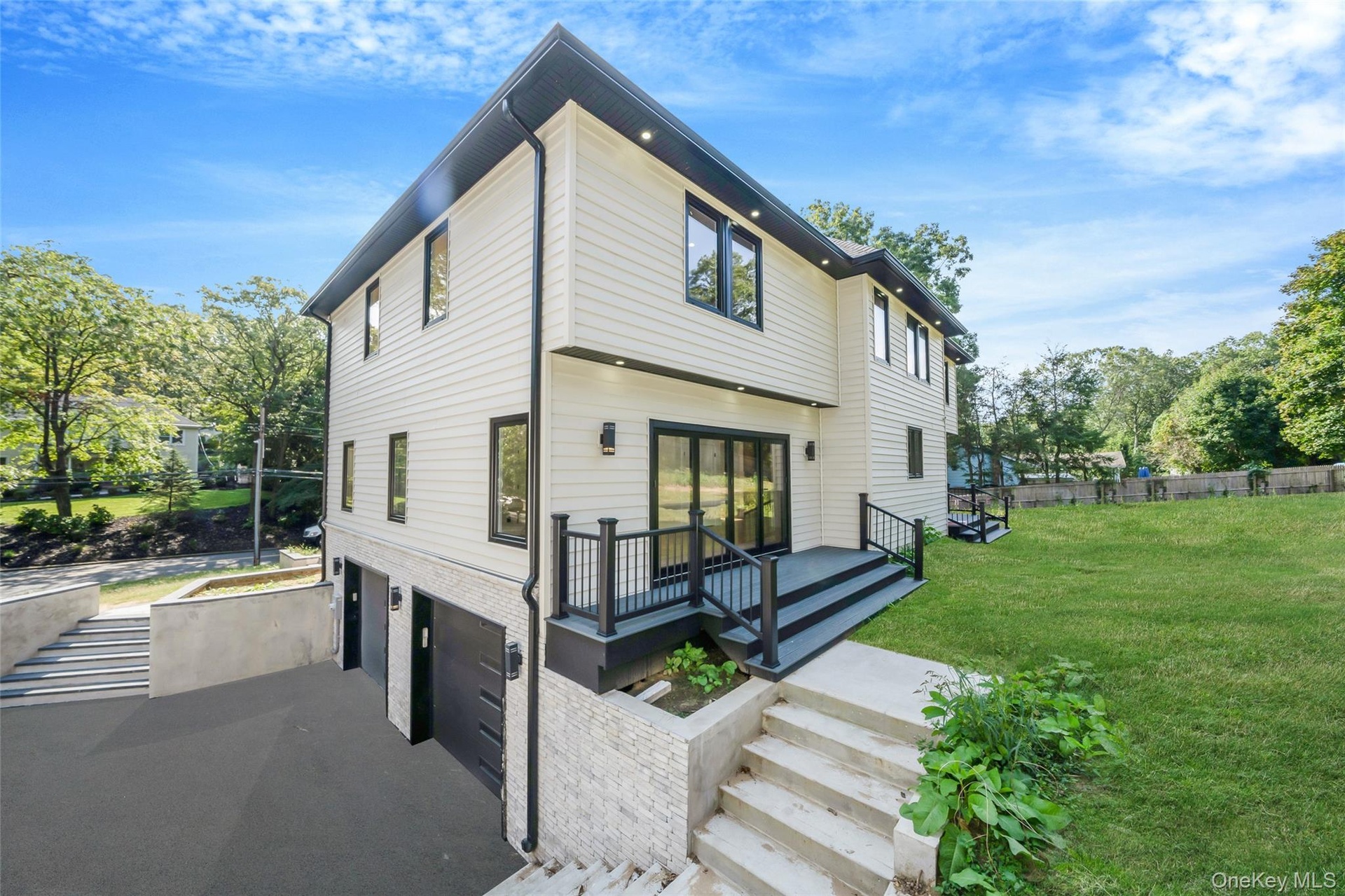 - View of home's exterior featuring asphalt driveway, a garage, stairway, and a lawn