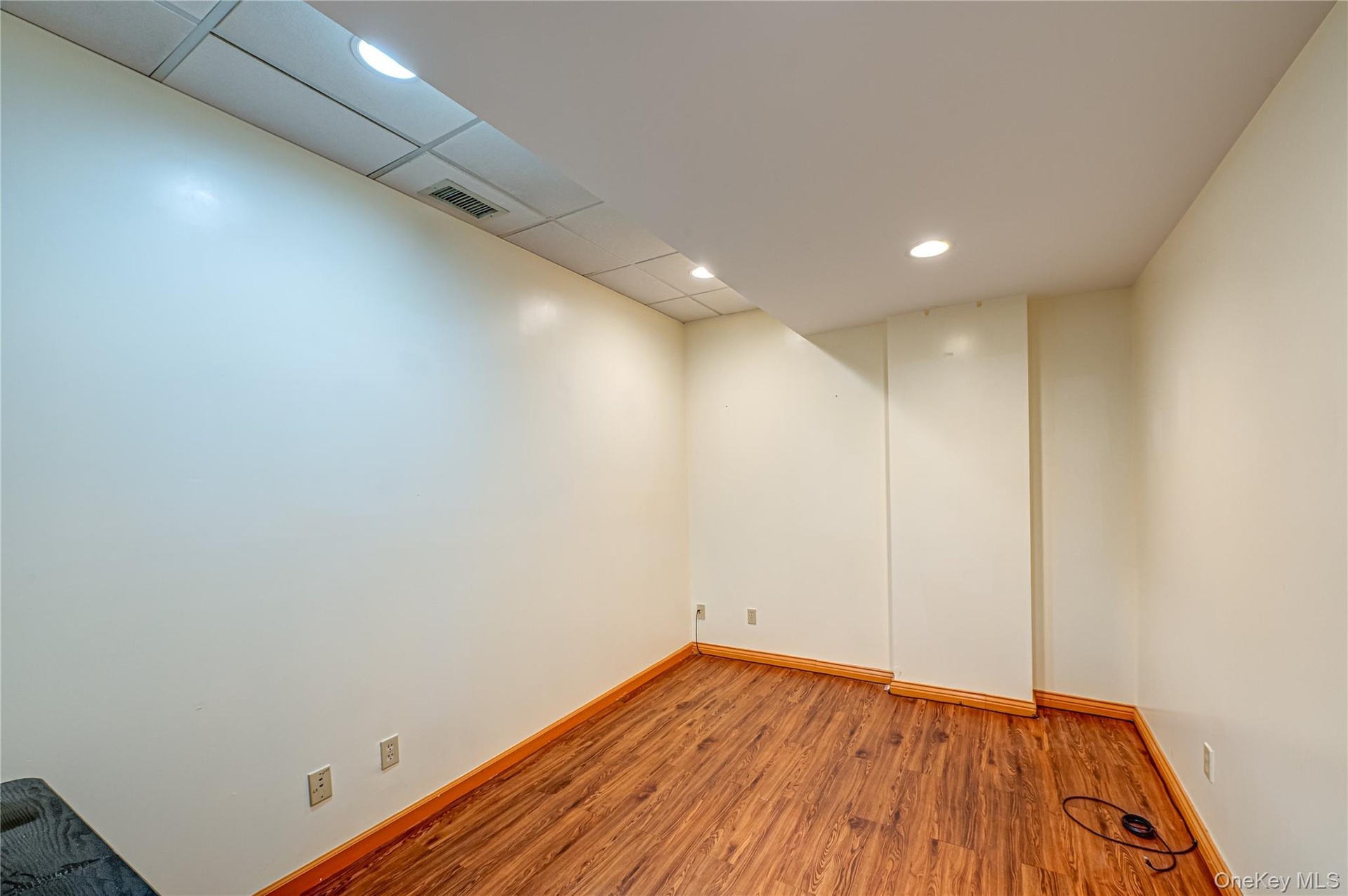 - Unfurnished room featuring wood finished floors and a drop ceiling