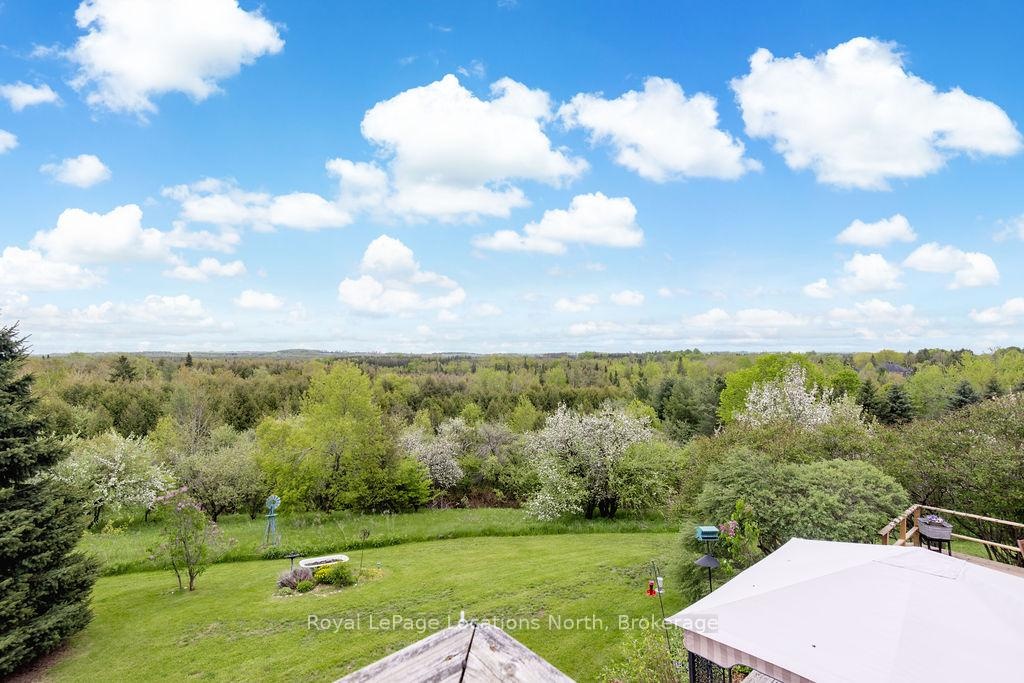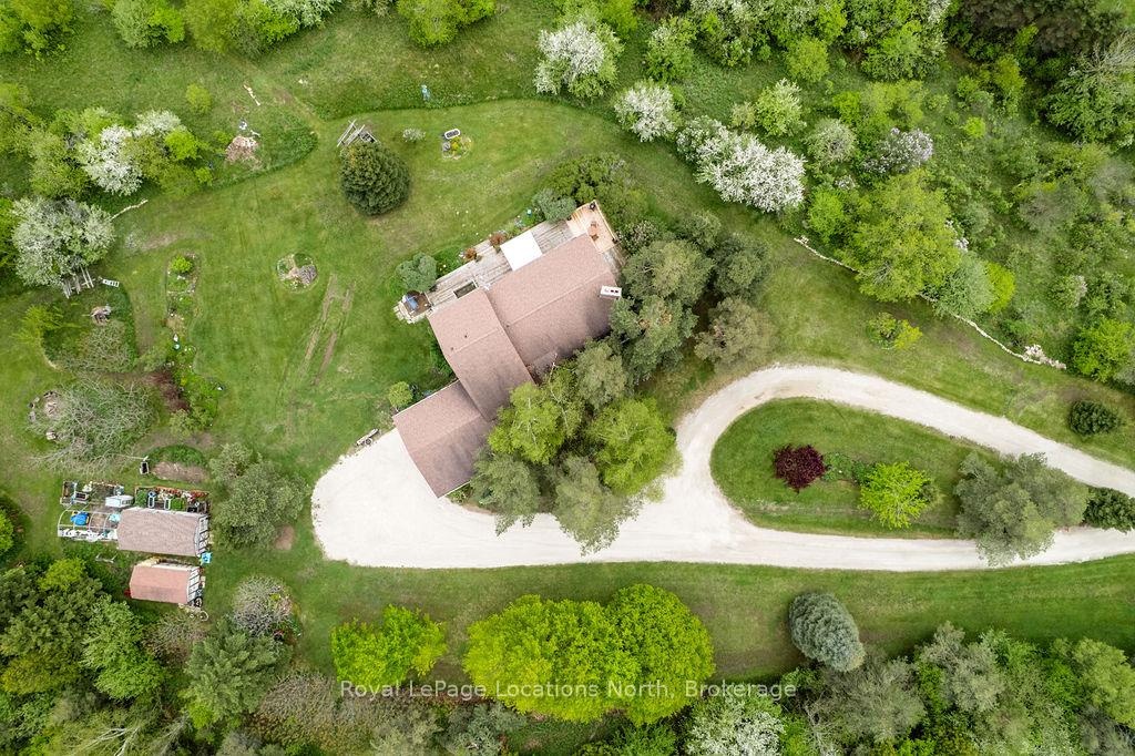 Rare FIND- Prestigious Estate Living on Nearly 10 Acres in Garafraxa Woods. Welcome to your private country retreat in the highly sought-after Garafraxa Woods estate community-just 5 minutes from the heart of Orangeville. Set on an impressive 9.23-acre lot, this custom home is nestled down a long, winding driveway and perched atop a hill, offering breathtaking views of the rolling countryside.Surrounded by mature trees and scenic trails, the property is perfect for four-wheeling, hiking, snowshoeing, and enjoying year-round outdoor adventures. The stone and cedar exterior blends beautifully with the natural surroundings, while the interior is filled with warmth and character.Inside, you'll find 3+1 bedrooms, 4 bathrooms, and an inviting open-concept design featuring cathedral ceilings, floor-to-ceiling windows, and a large 3-sided wood-burning stone fireplace as the heart of the home. Rich wood floors flow throughout, creating a cozy yet upscale feel.The spacious primary suite is located on the private third floor, complete with an ensuite bathroom, while two additional bedrooms and a 4-piece bath are conveniently located on the main level. The finished lower level offers a walk-up, a separate bedroom, bathroom, kitchenette, rec room with pool table and sauna - making it ideal for extended family, guests, or in-law potential. There's also a large pool table room and plenty of storage. An attached 2-car garage provides access to both the basement and the laundry/mudroom. Walkout decks overlook the expansive property, perfect for relaxing or entertaining. The home also benefits from a newly installed gas line.This is more than a home, it's a lifestyle. If you're looking for space, privacy, and a connection to nature without sacrificing proximity to town, this exceptional estate delivers it all. Opportunities like this in Garafraxa Woods are rare - don't miss your chance.