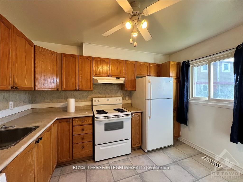 This sunny and well-maintained 3-bedroom end unit townhome offers a warm and inviting layout. The open-concept living room features laminate floors (2024), a large window, and a patio door that leads to a fully fenced backyard with a beautiful stone patio, perfect for relaxing or entertaining. 2 piece powder room. on the main level. A generous dining area and a cozy eat-in kitchen with solid cabinetry provide ample space for everyday living. Second level features a spacious primary bedroom with a large closet, along with two additional good-sized bedrooms and a full 3 piece bathroom. New laminate flooring throughout the home with carpet on the stairs(2024) for comfort and functionality. Close to shopping, recreational facilities, and public transit. Parking number 17 Street parking allowed after 4pm(Mon-Fri) Weekends anytime. Upgrades include laminate flooring (2024) Bathroom ceramic floor (2024) furnace (2024) AC (2025)Tenant pays utilities. *FULLY FINISHED BASEMENT*