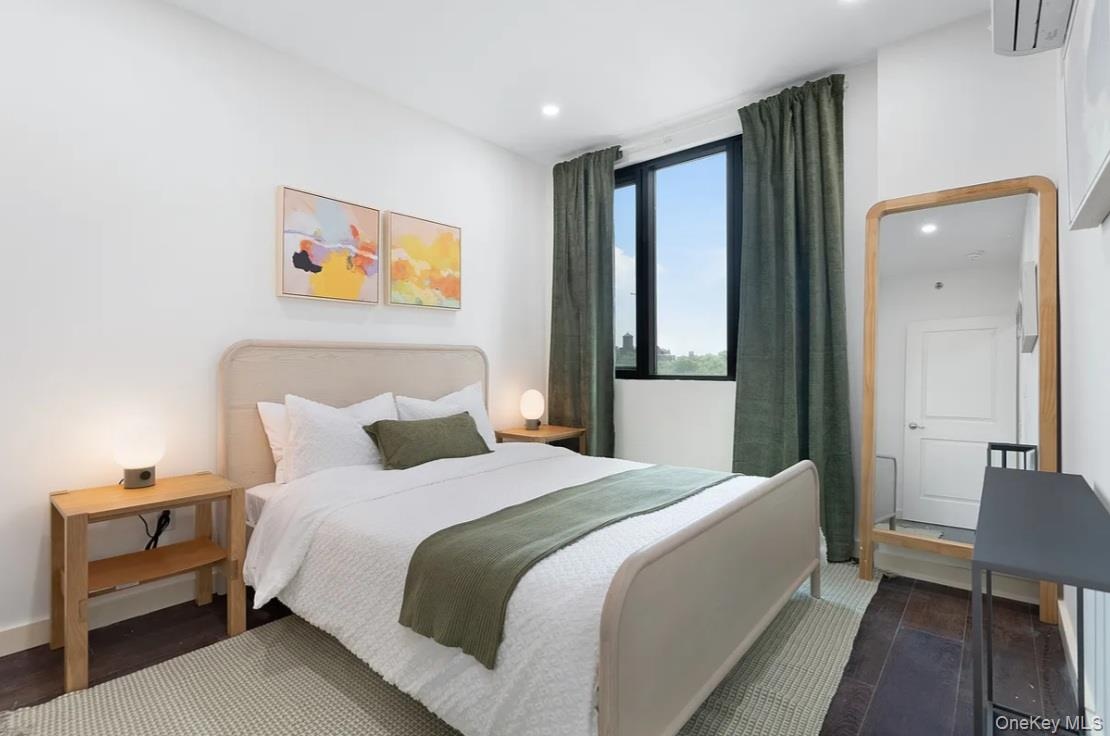 - Bedroom with wood finished floors, a wall unit AC, and recessed lighting