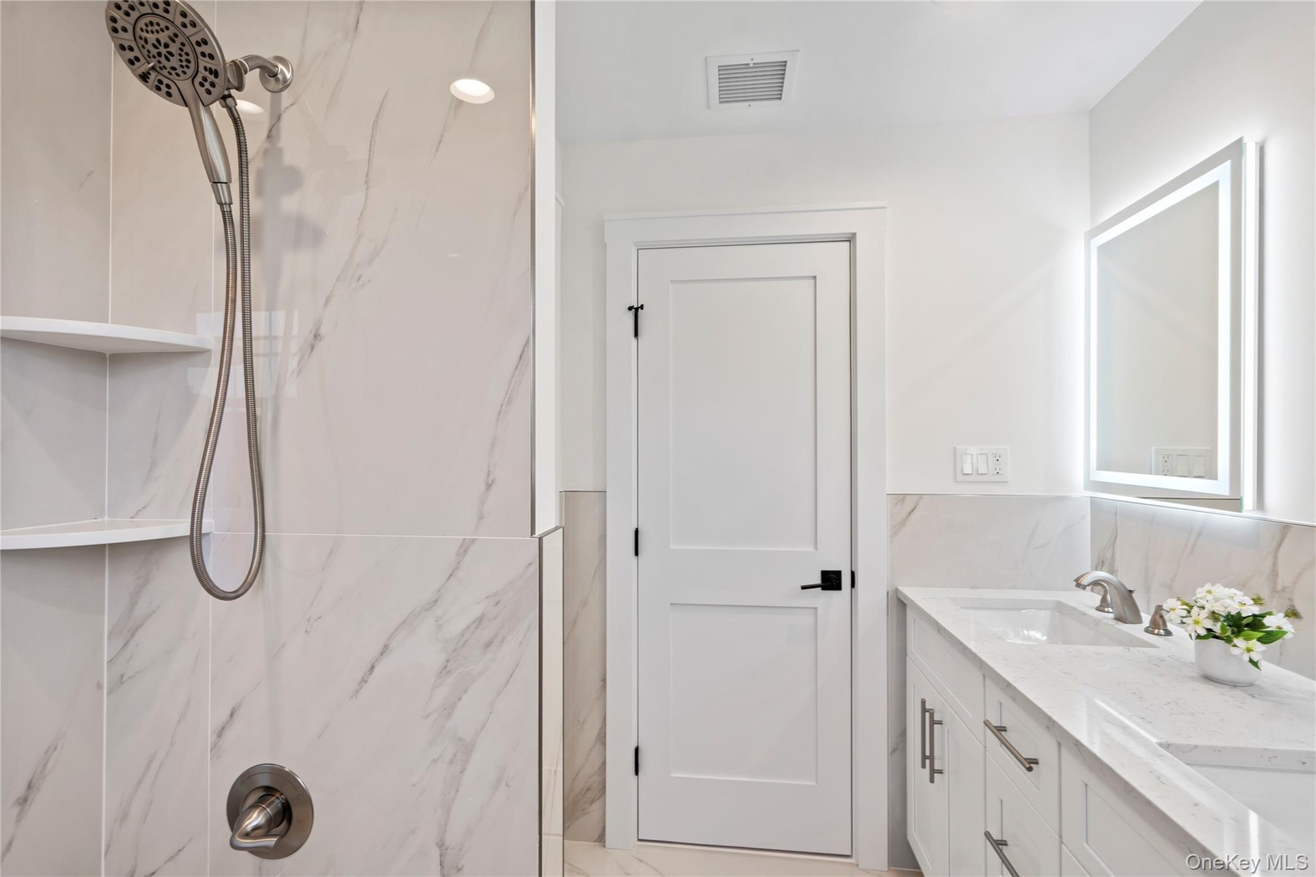 - Bathroom with vanity, a marble finish shower, and tile walls