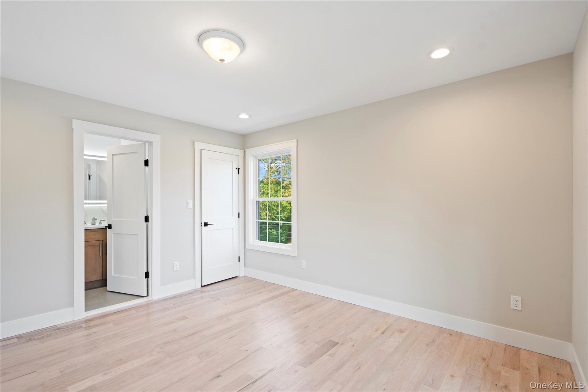 - Bedroom featuring Oak wood floors, recessed lighting, connected bathroom, and a closet