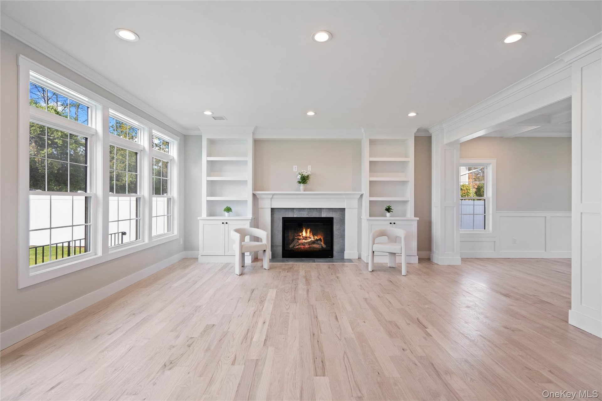 - Unfurnished living room featuring ornamental molding, recessed lighting, a fireplace, Wide Oak wood flooring, and built in features