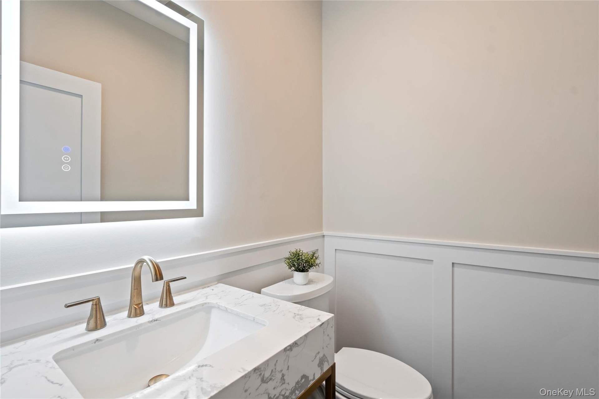 - Powder Room with vanity, wainscoting, and a decorative wall