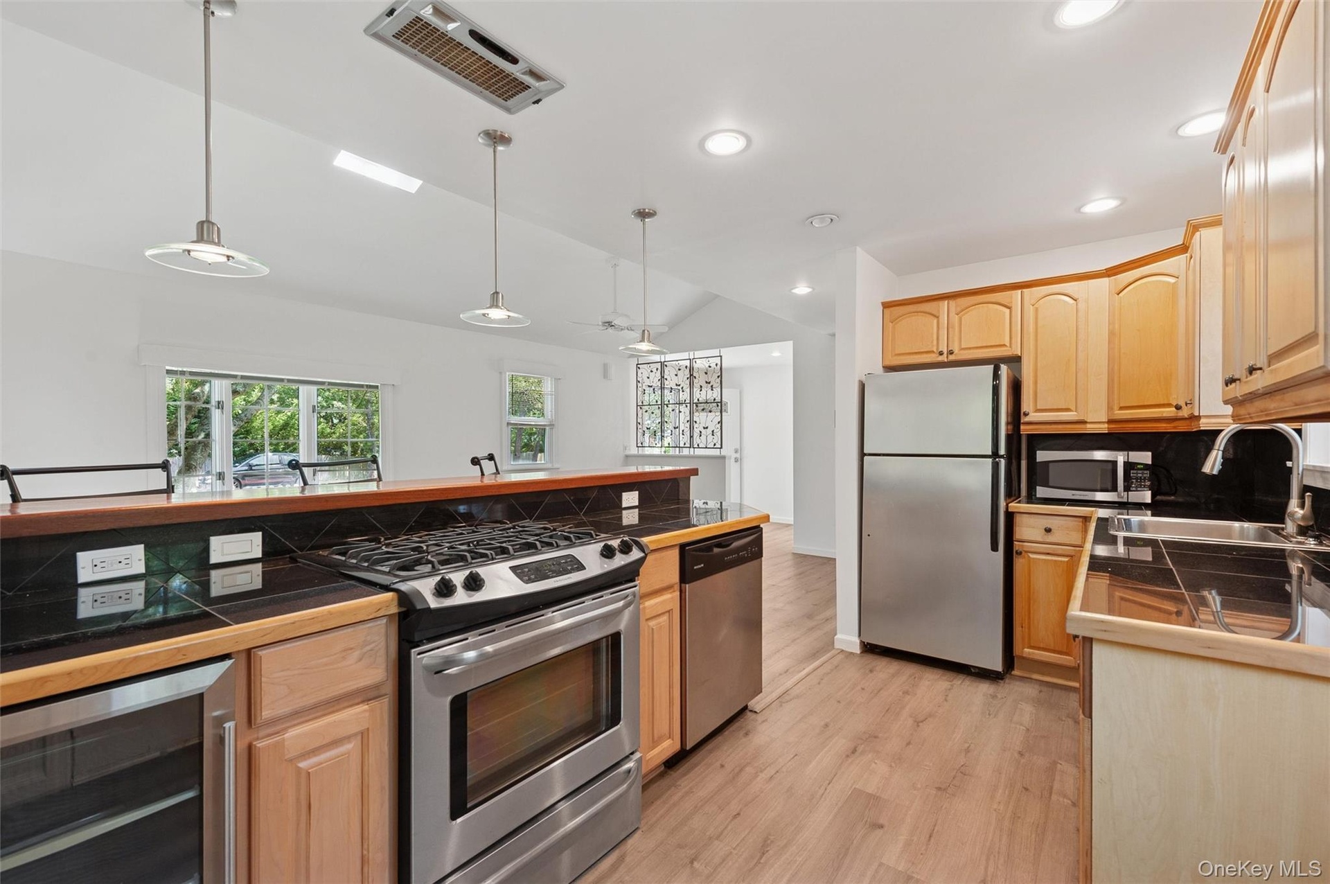 - Kitchen featuring appliances with stainless steel finishes, lofted ceiling, beverage cooler, light wood finished floors, and light brown cabinetry