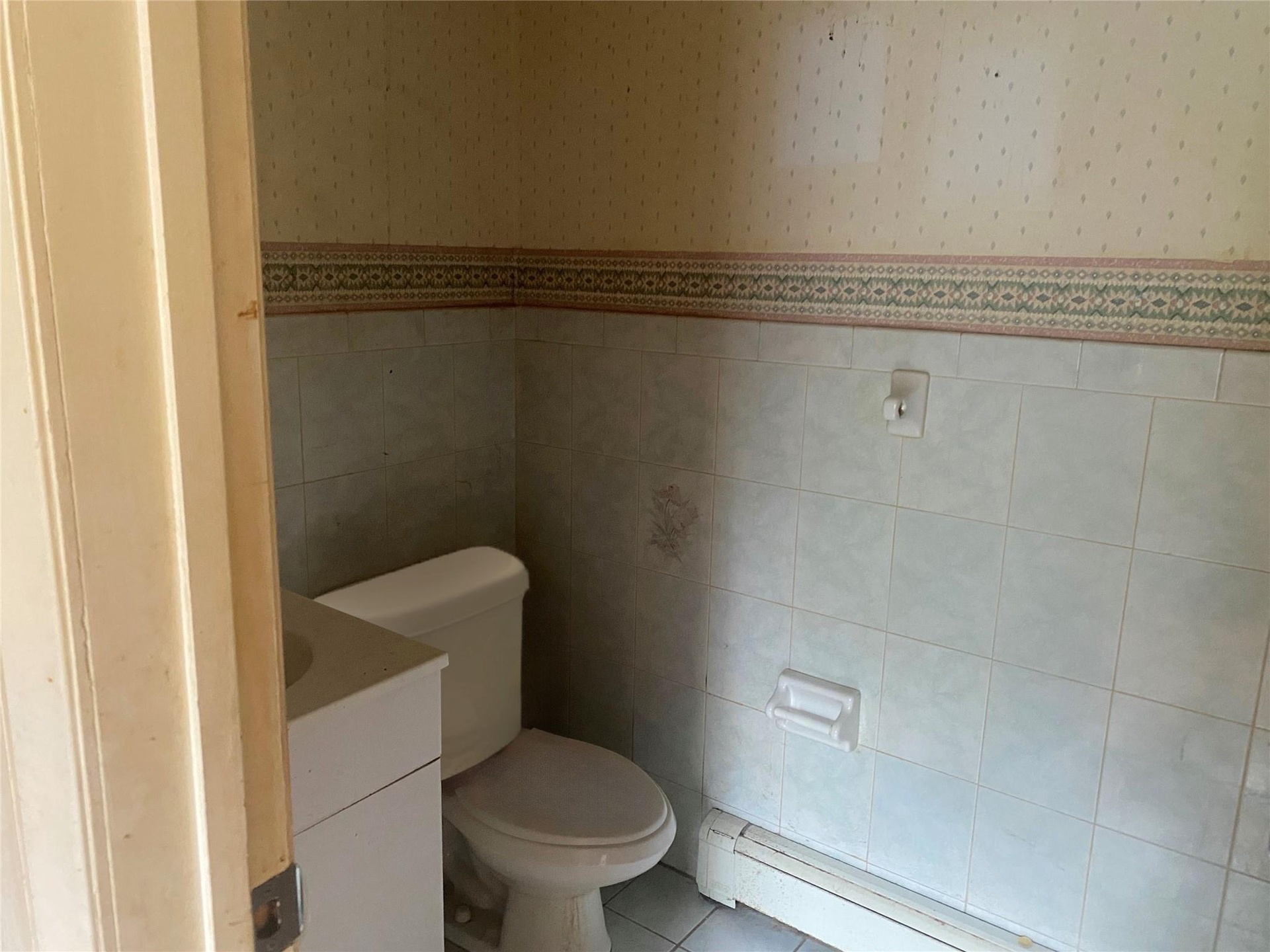- Half bath featuring tile walls, vanity, and tile patterned flooring