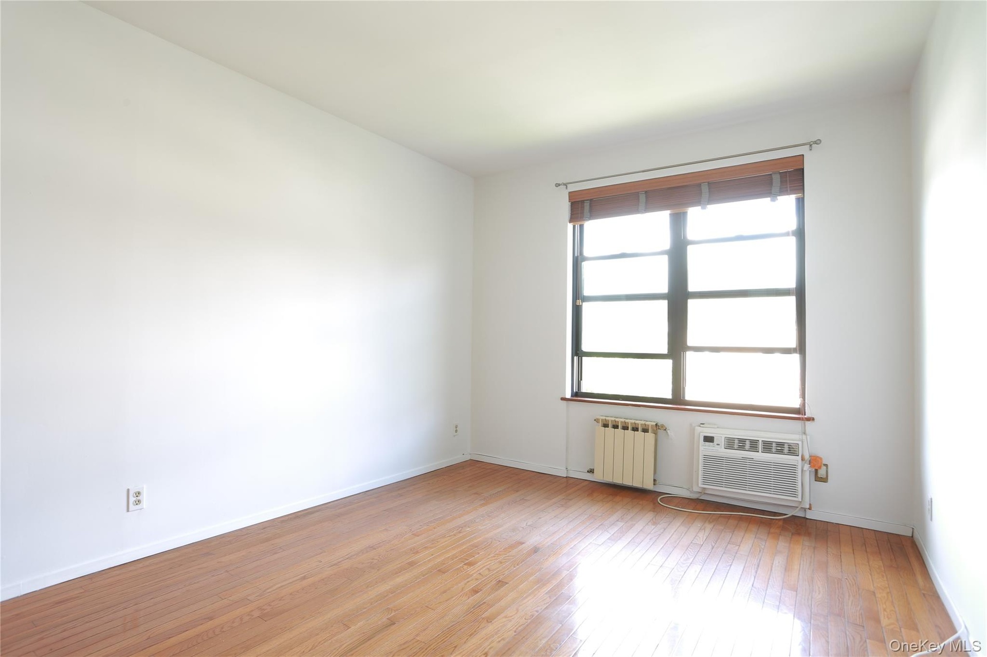 - 1st bedroom with light wood finished floors, radiator, and a wall mounted AC