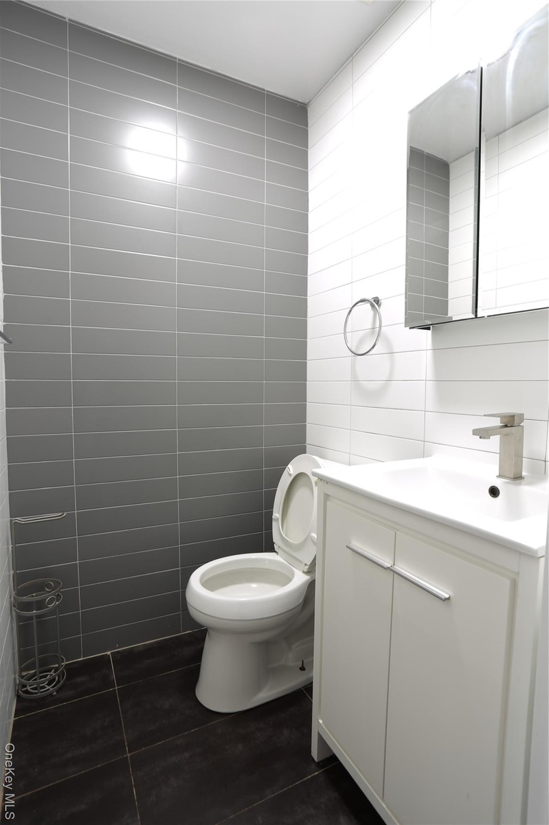 - Half Bathroom with tile walls, vanity, and tile patterned flooring