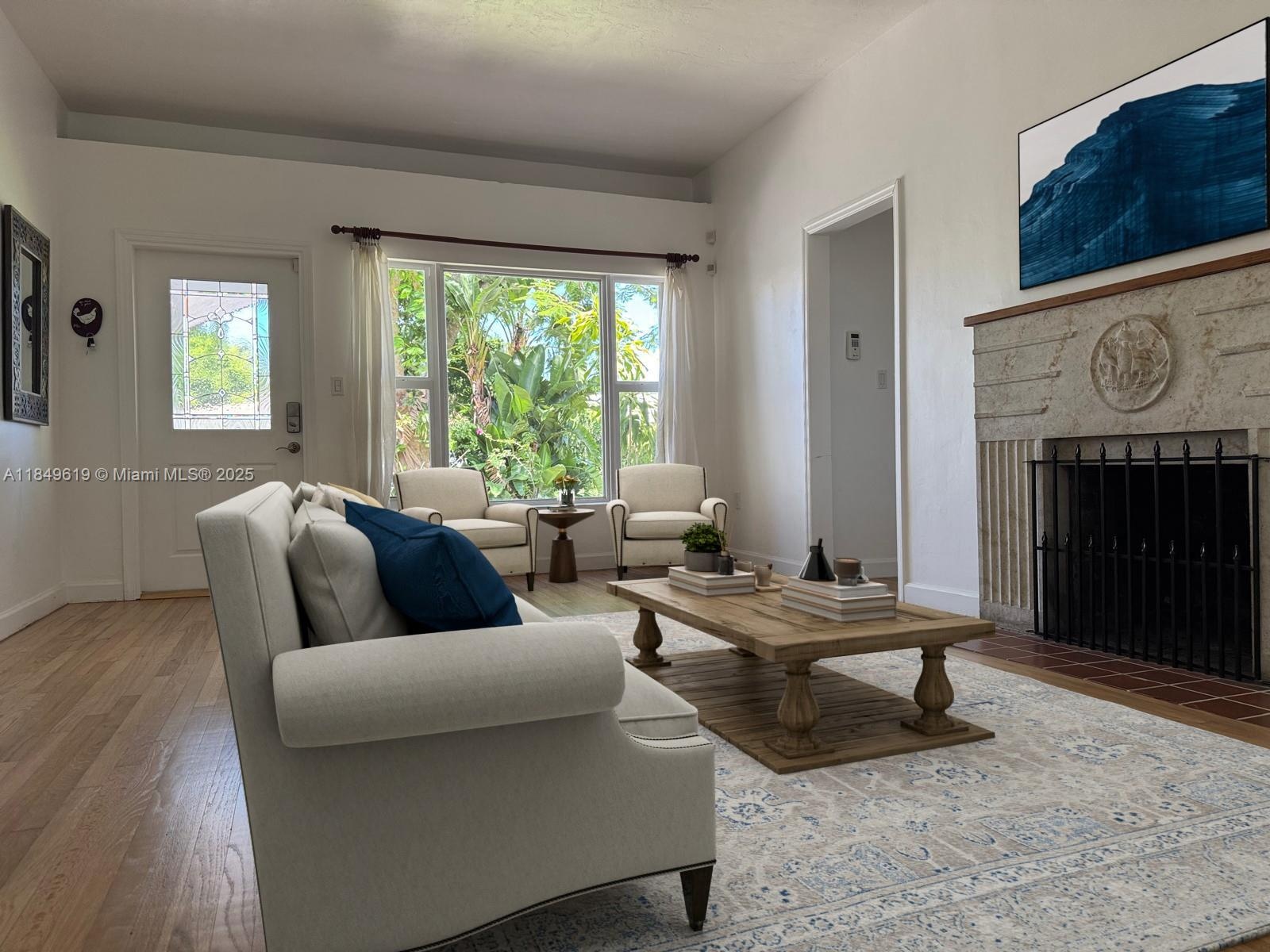 This special home was built in 1946 and features many architectural details. Larger than tax rolls as per architect. It is surrounded by lush vegetation on a 5,350 sq ft lot, creating an oasis-like atmosphere. The home includes 2 bedrooms/ 2 baths, along with a one-car garage, air conditioned, ready to use as an office. Impact windows and doors, an updated kitchen, hardwood floors throughout, fireplace. The beautiful Florida room has windows that overlook the gorgeous garden, which is alive with the songs of many birds. Located within walking distance of downtown shopping, the Coral Gables Country Club golf course, and tennis courts, also close to the Biltmore Hotel. This is a fantastic location in an A+ neighborhood, ideal for public elementary and middle schools. This home is a turn key!