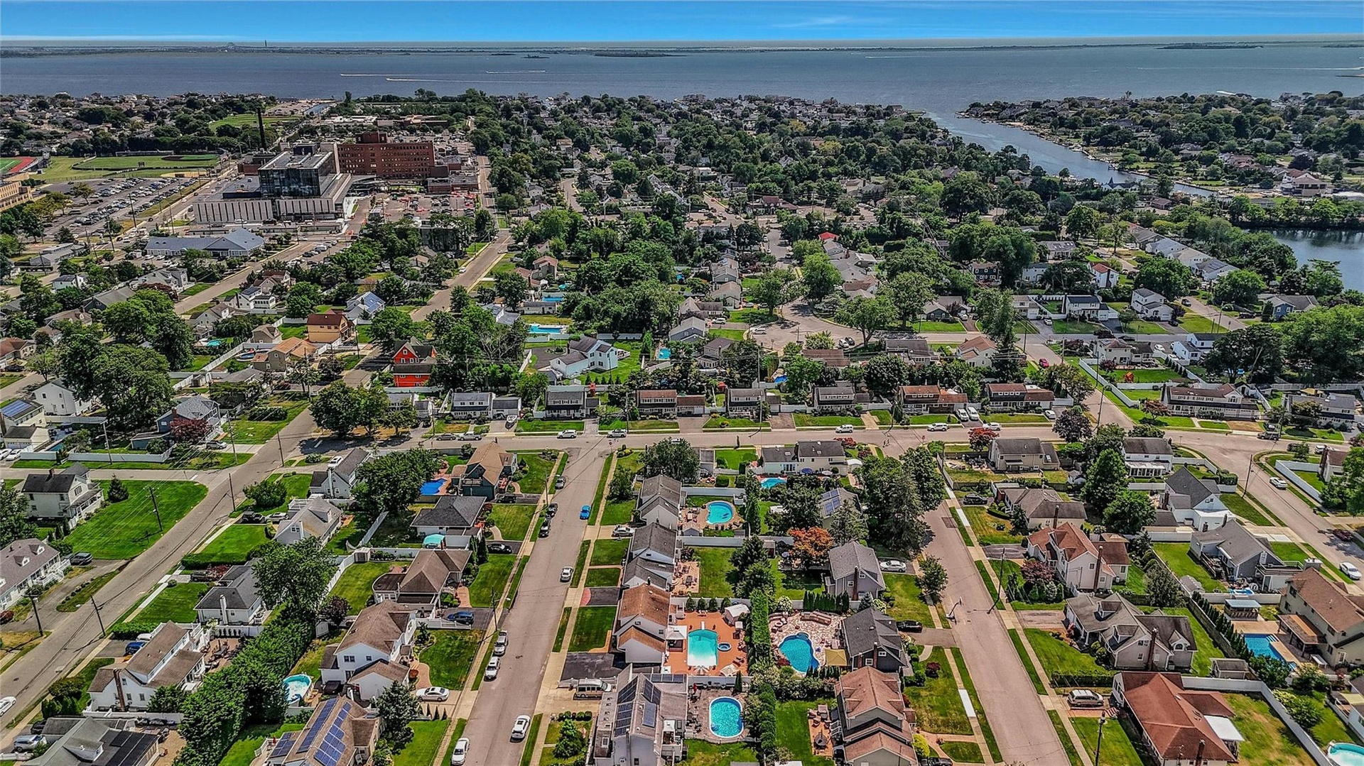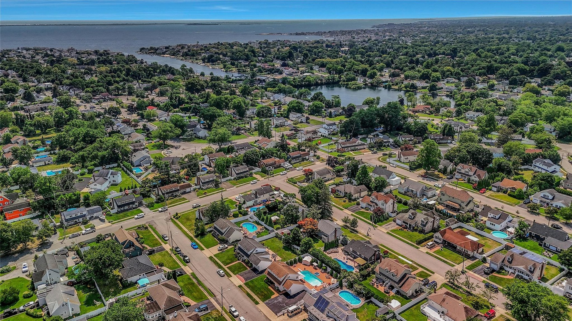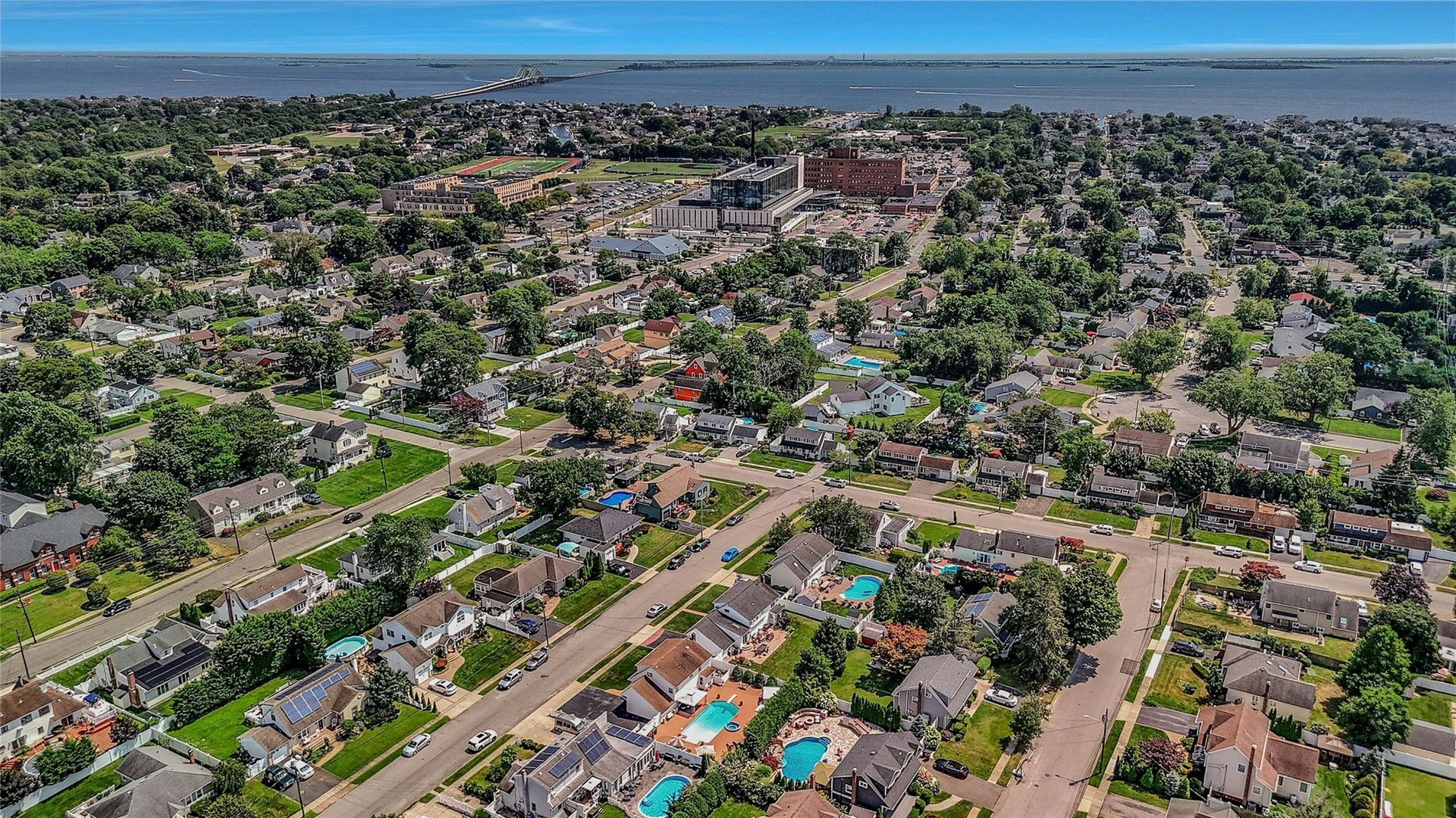 - Aerial view of residential area featuring a pool and a nearby body of water