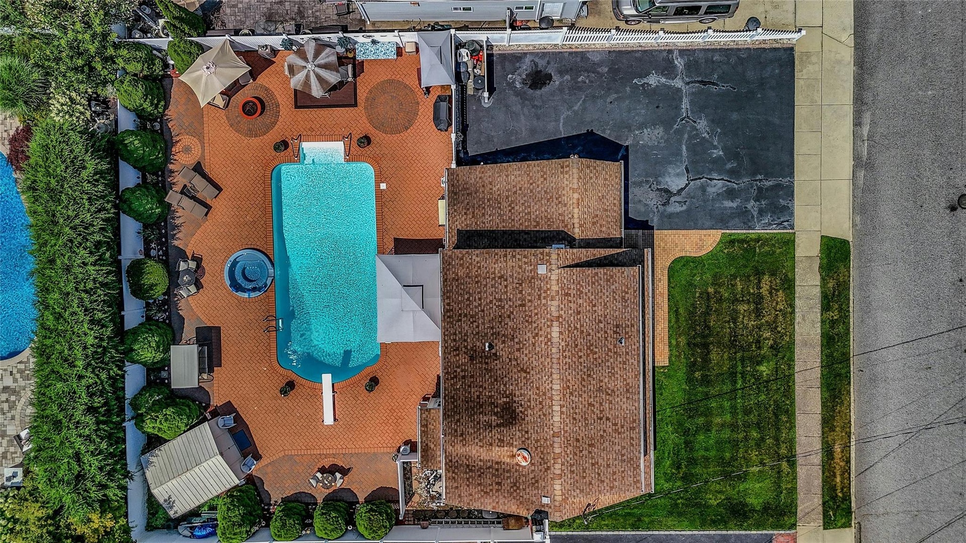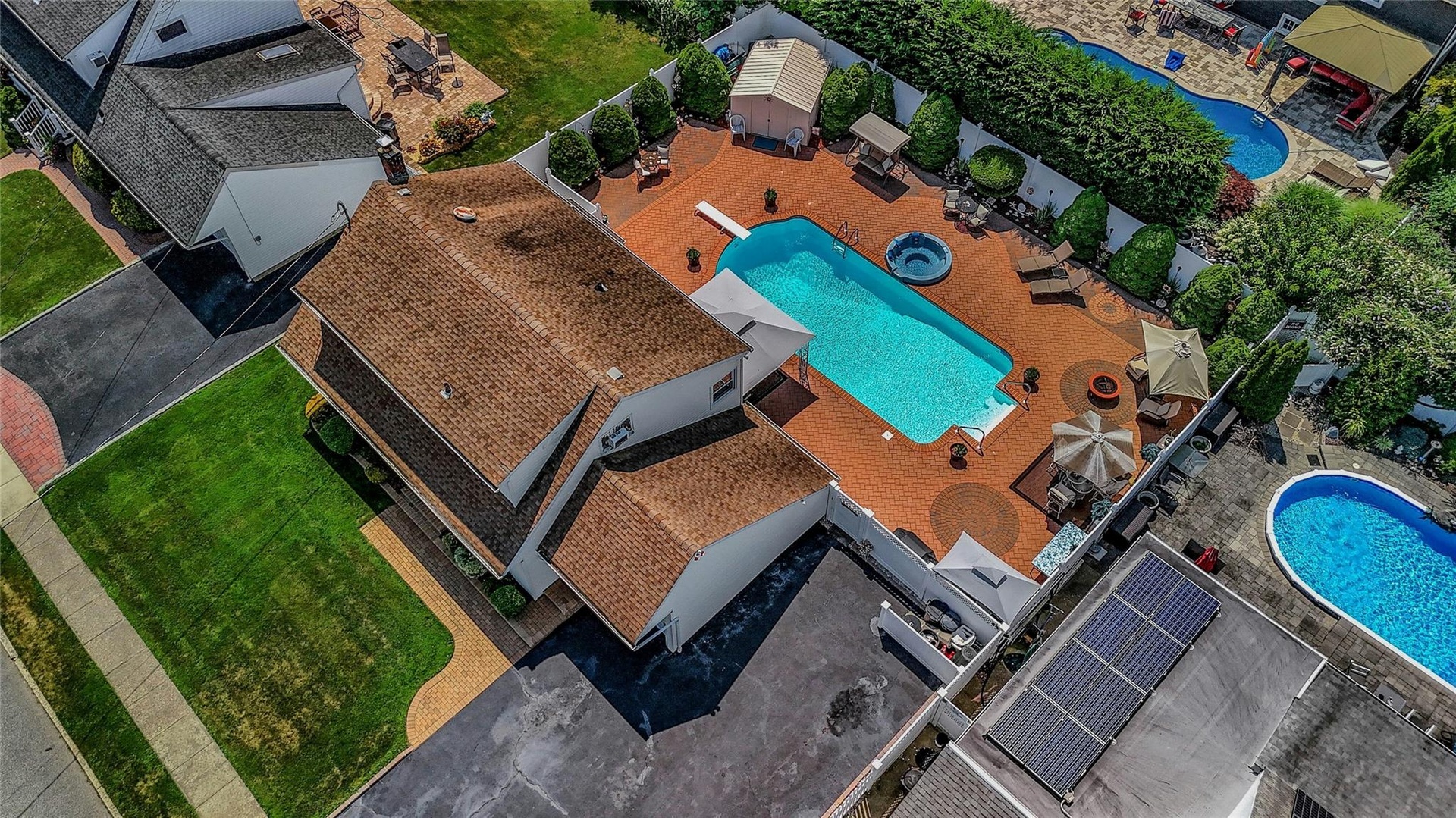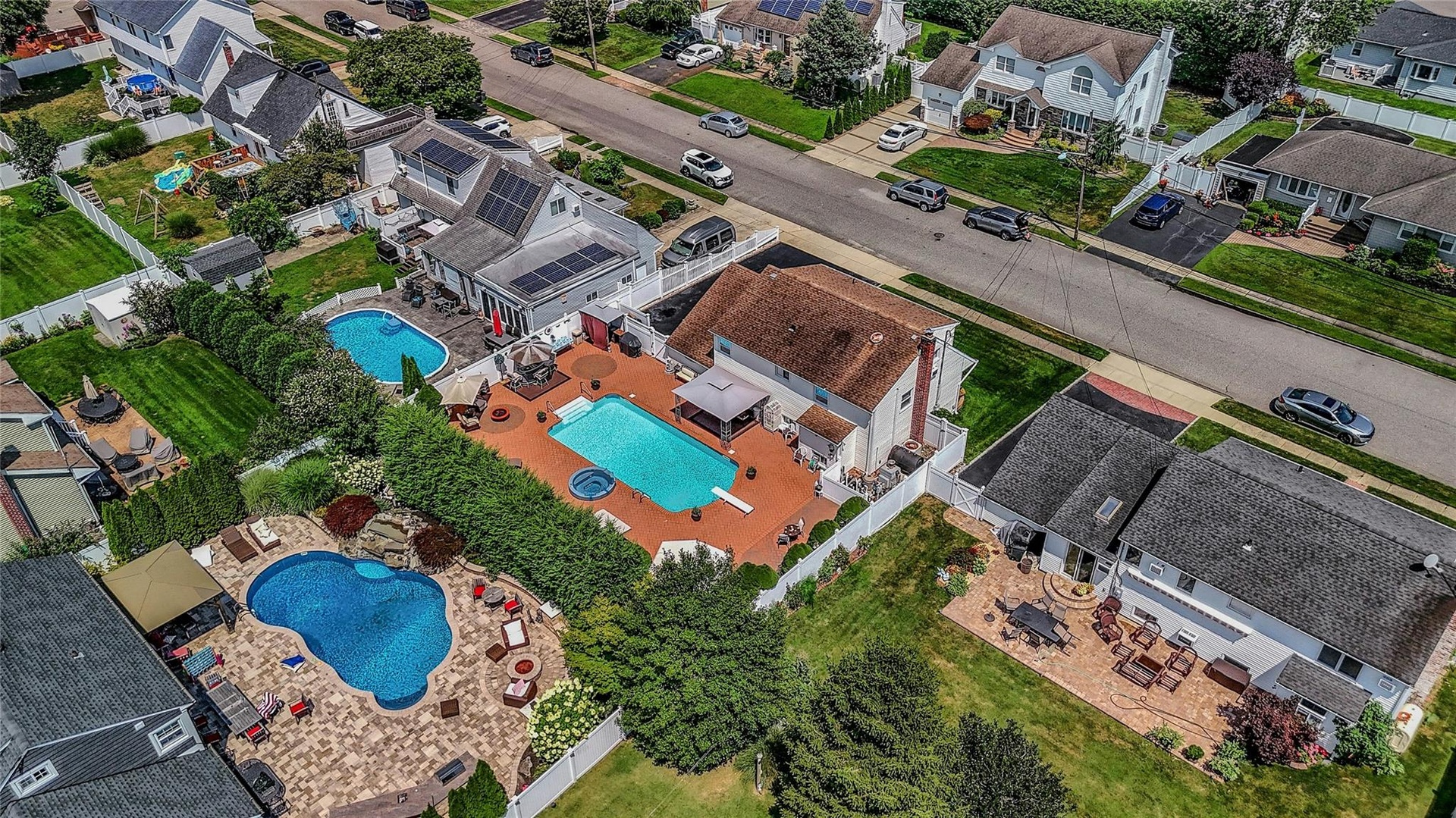 - Aerial view of residential area featuring a pool and a nearby body of water