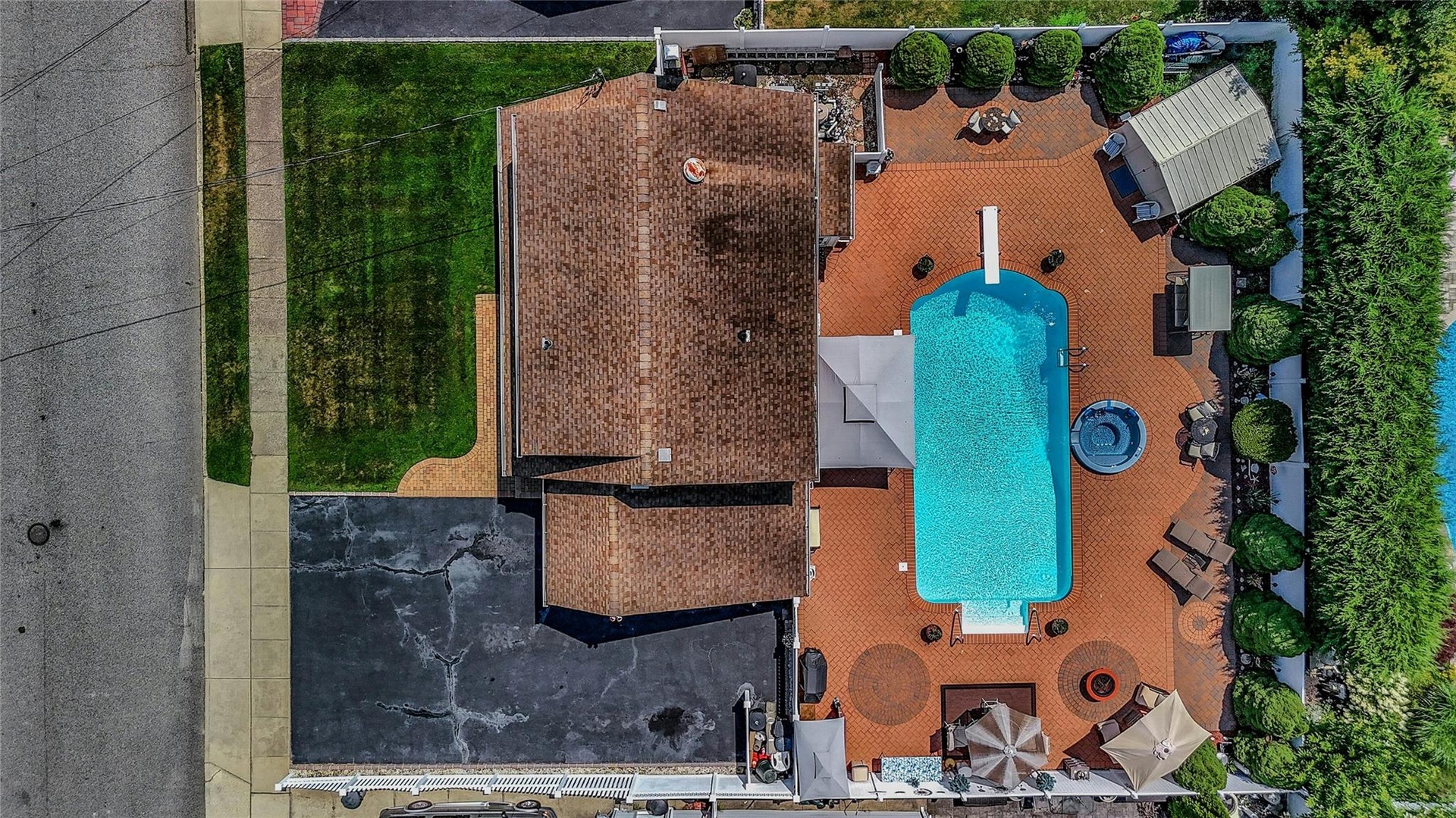 - Aerial view of residential area featuring a nearby body of water and a pool area