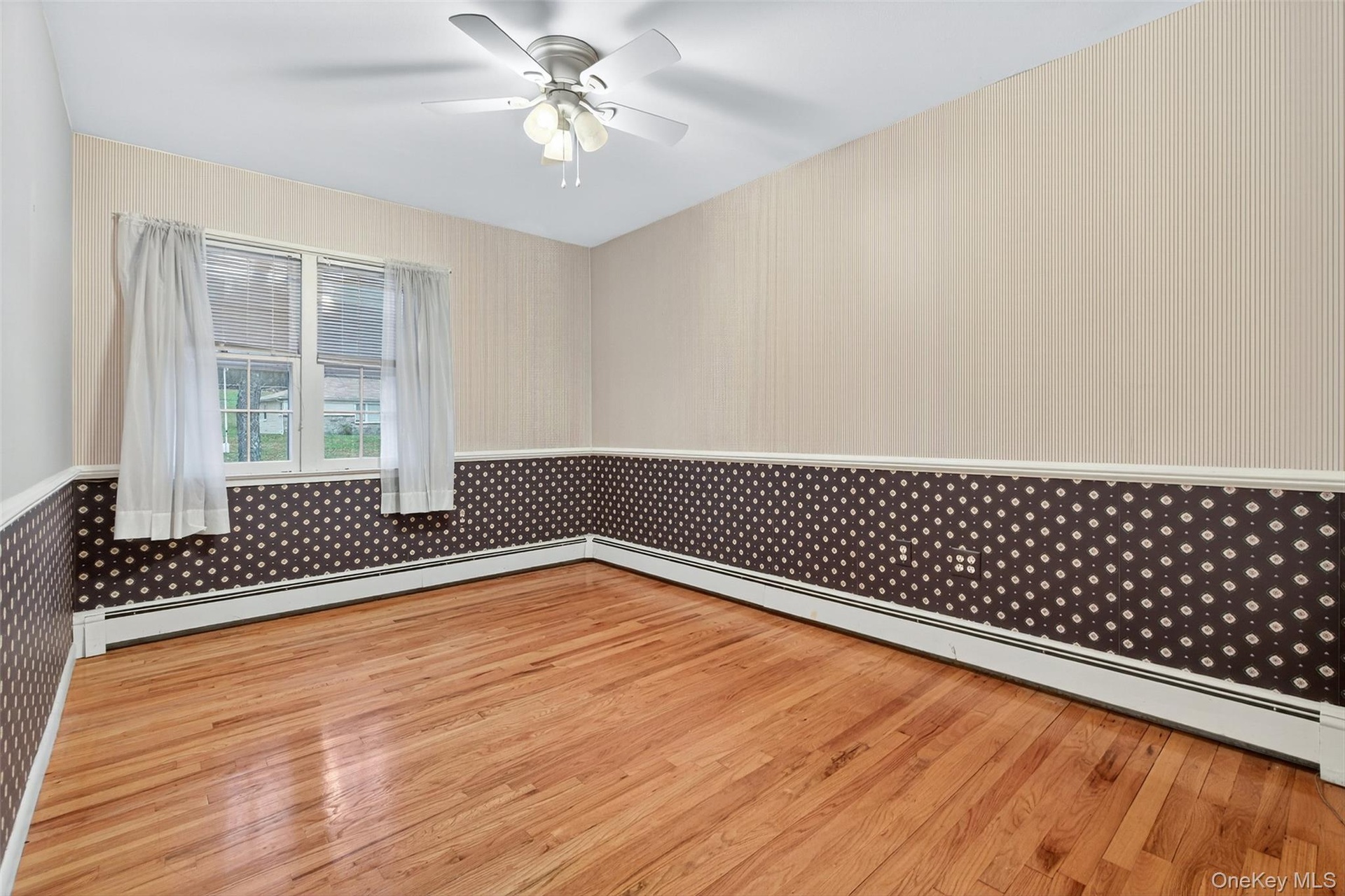 - Unfurnished room with a baseboard radiator, light wood-style floors, wallpapered walls, and ceiling fan