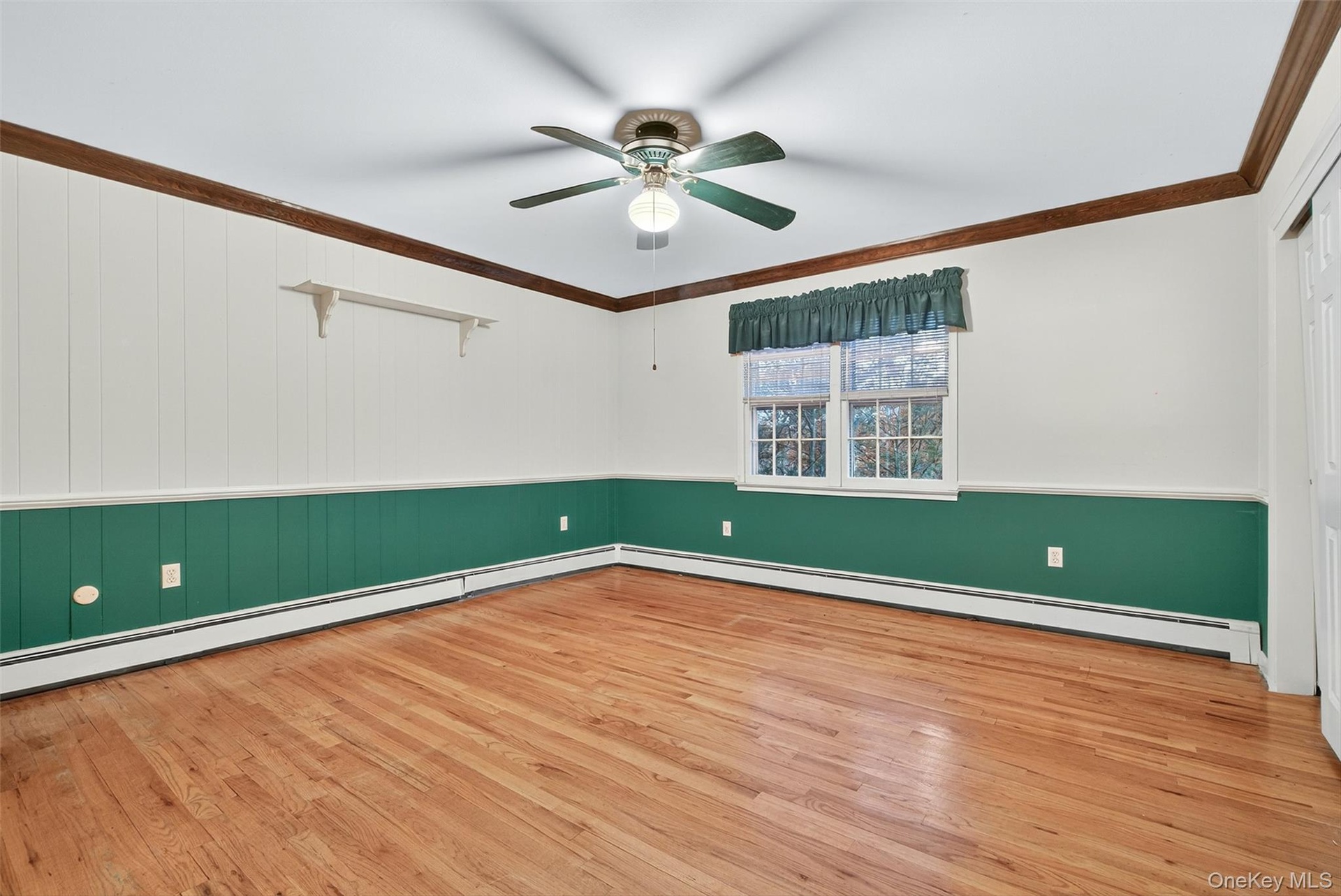 - Empty room with light wood finished floors, crown molding, a baseboard radiator, a ceiling fan, and wooden walls