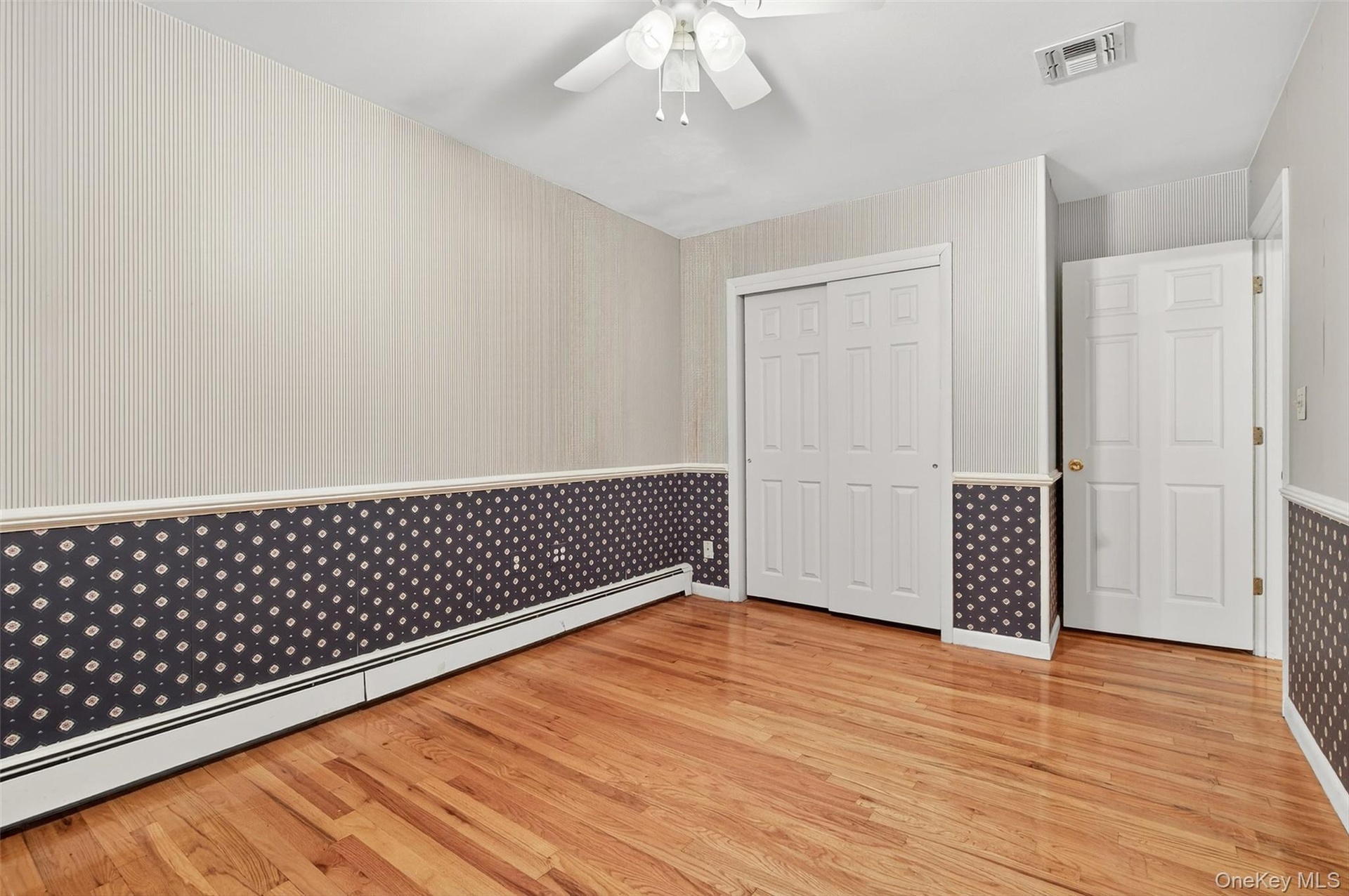 - Unfurnished bedroom with baseboard heating, wallpapered walls, light wood-type flooring, a closet, and a ceiling fan