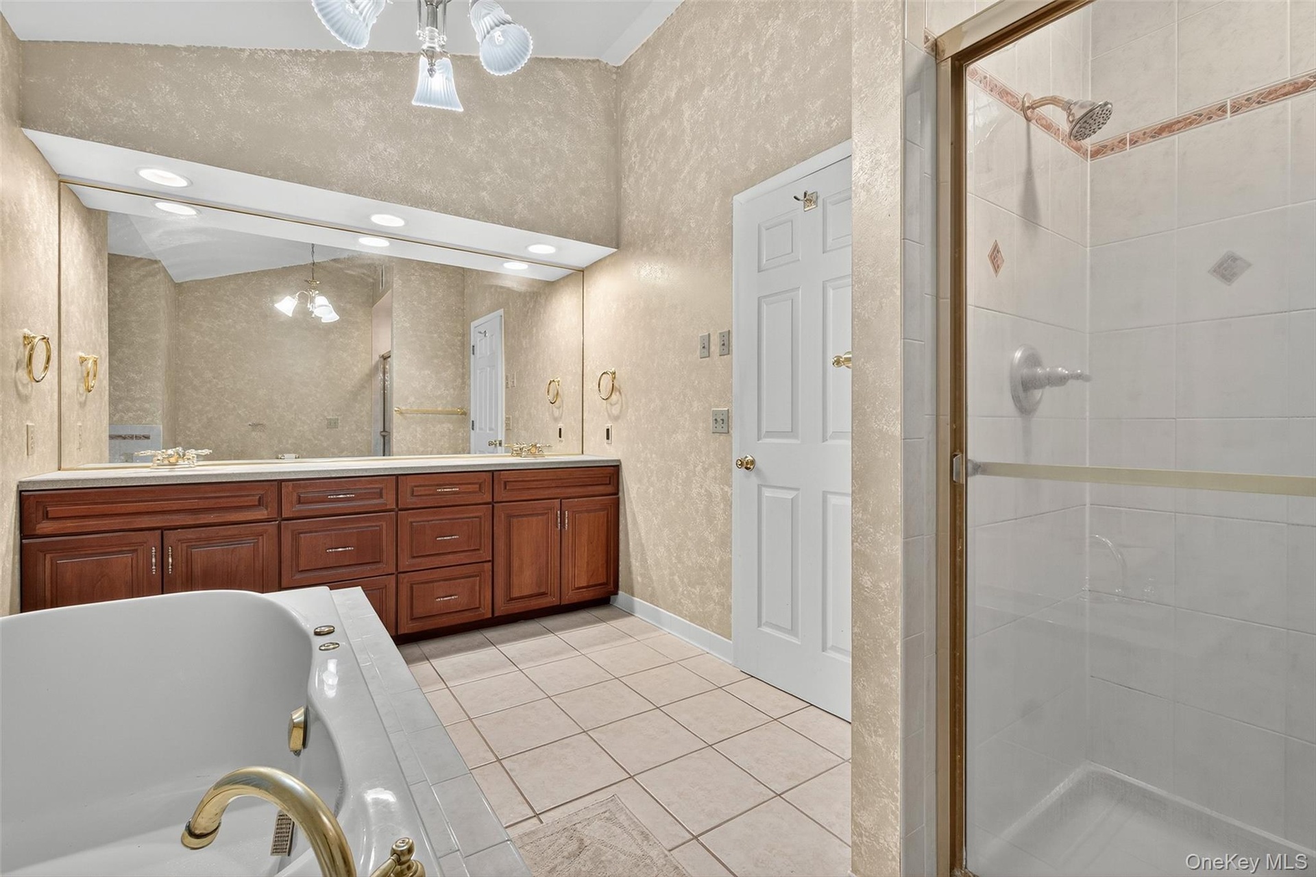 - Full bathroom featuring light tile patterned floors, double vanity, a bathtub, recessed lighting, and a shower stall