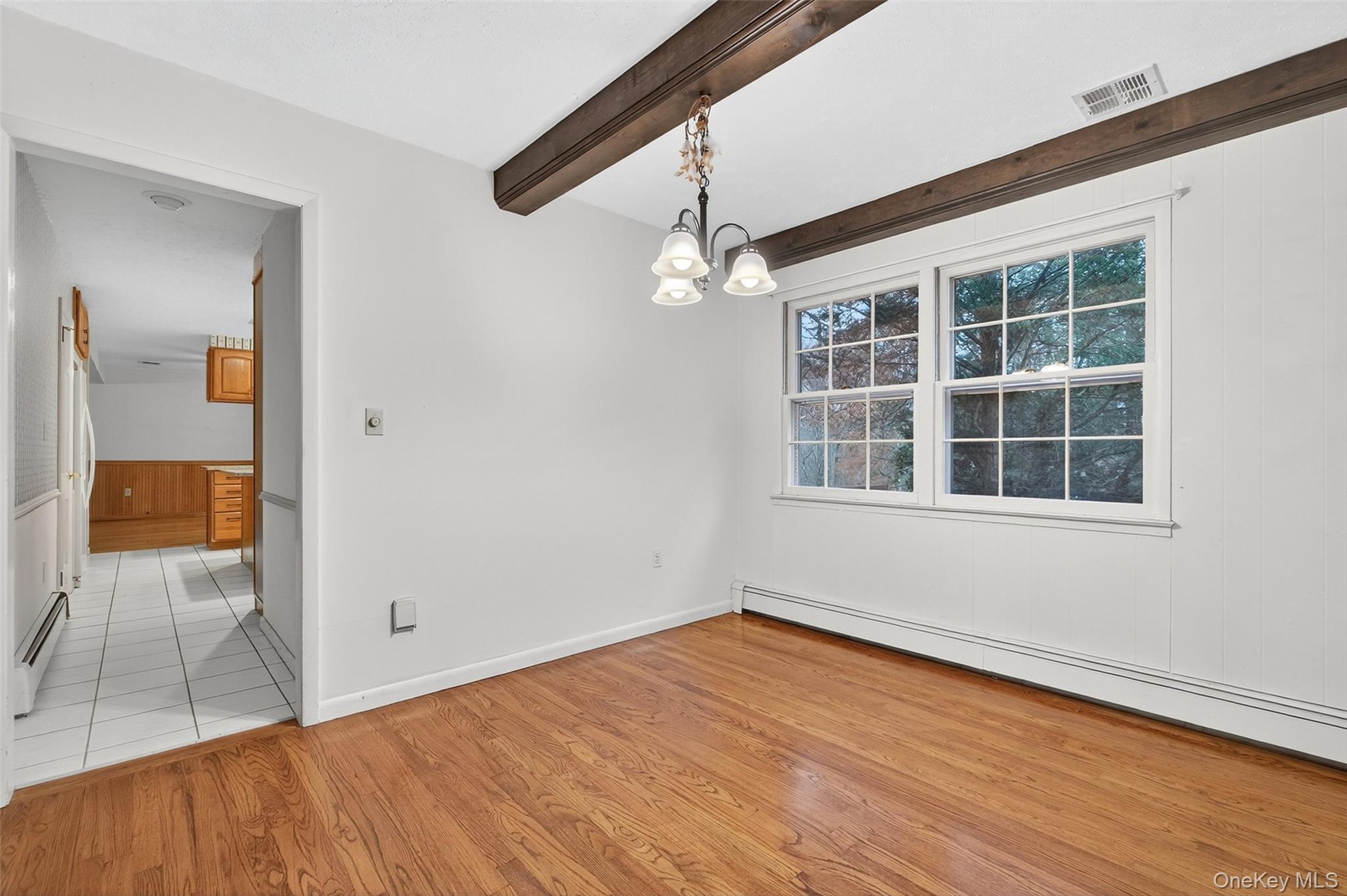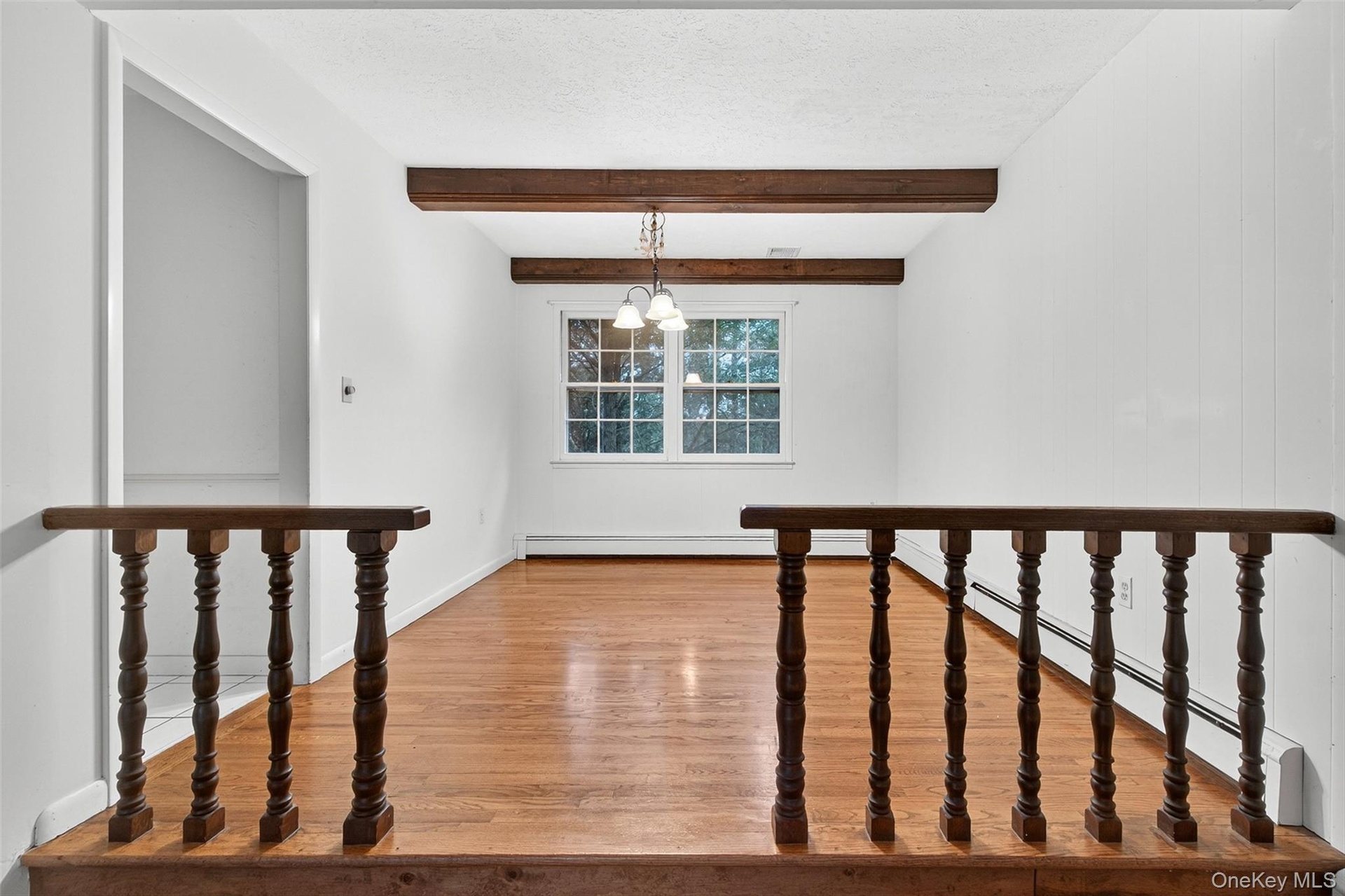 - Unfurnished dining area featuring baseboard heating, beam ceiling, light wood-type flooring, and a chandelier