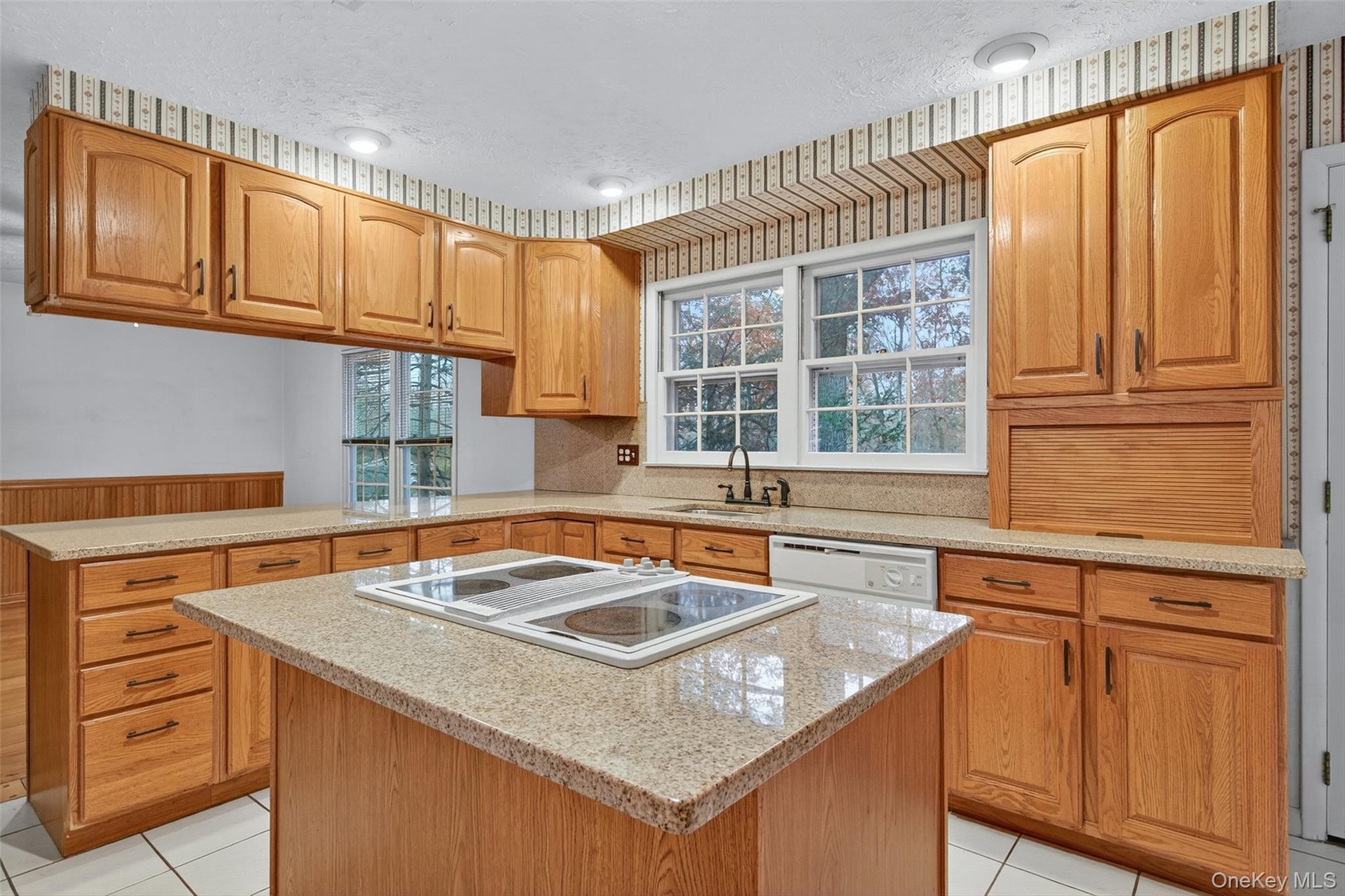 - Kitchen with light stone countertops, light tile patterned floors, white appliances, a center island, and a textured ceiling
