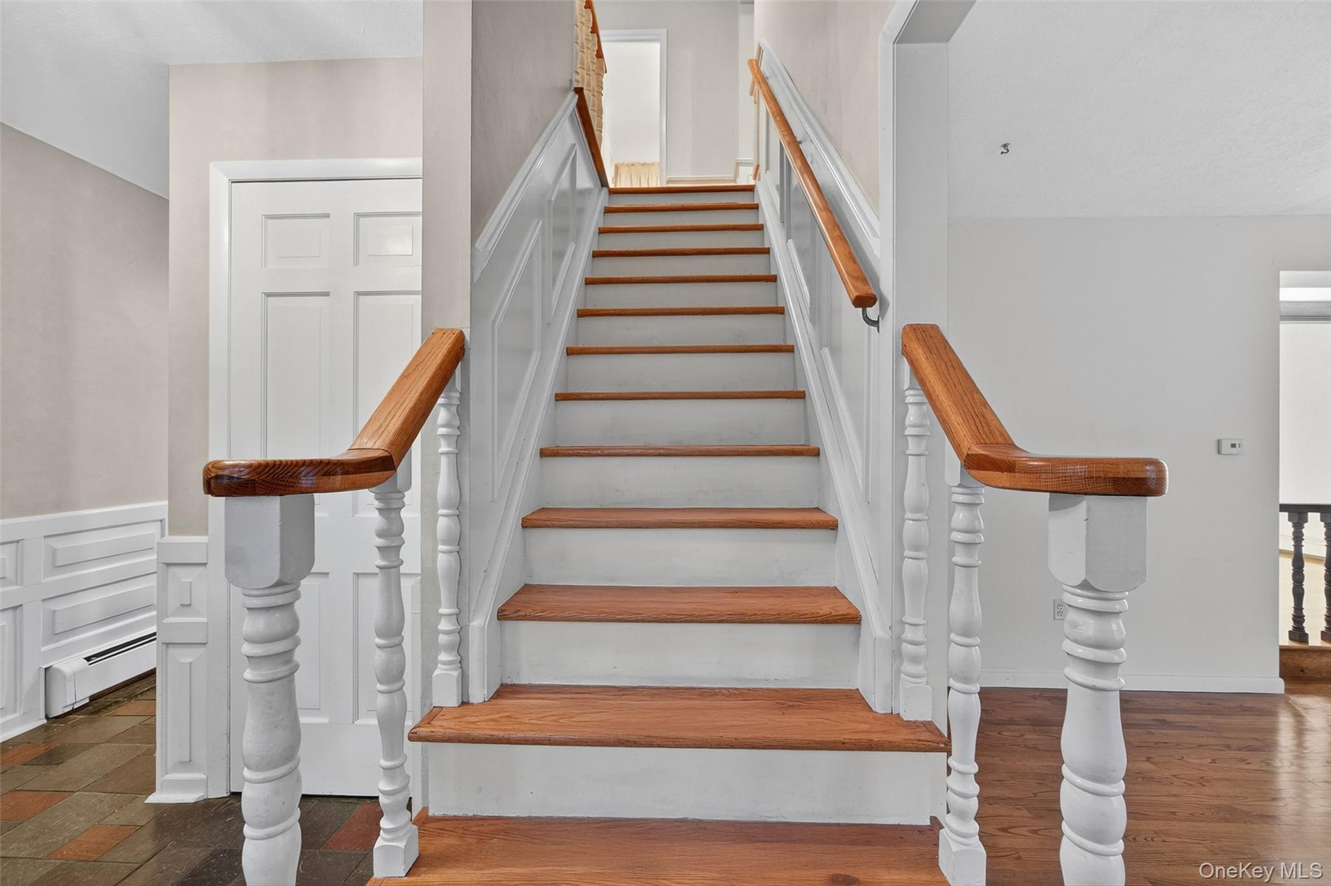 - Stairway with a wainscoted wall, a decorative wall, stone tile floors, a baseboard radiator, and a baseboard heating unit