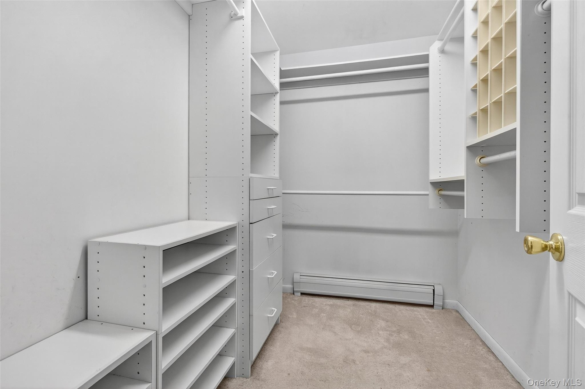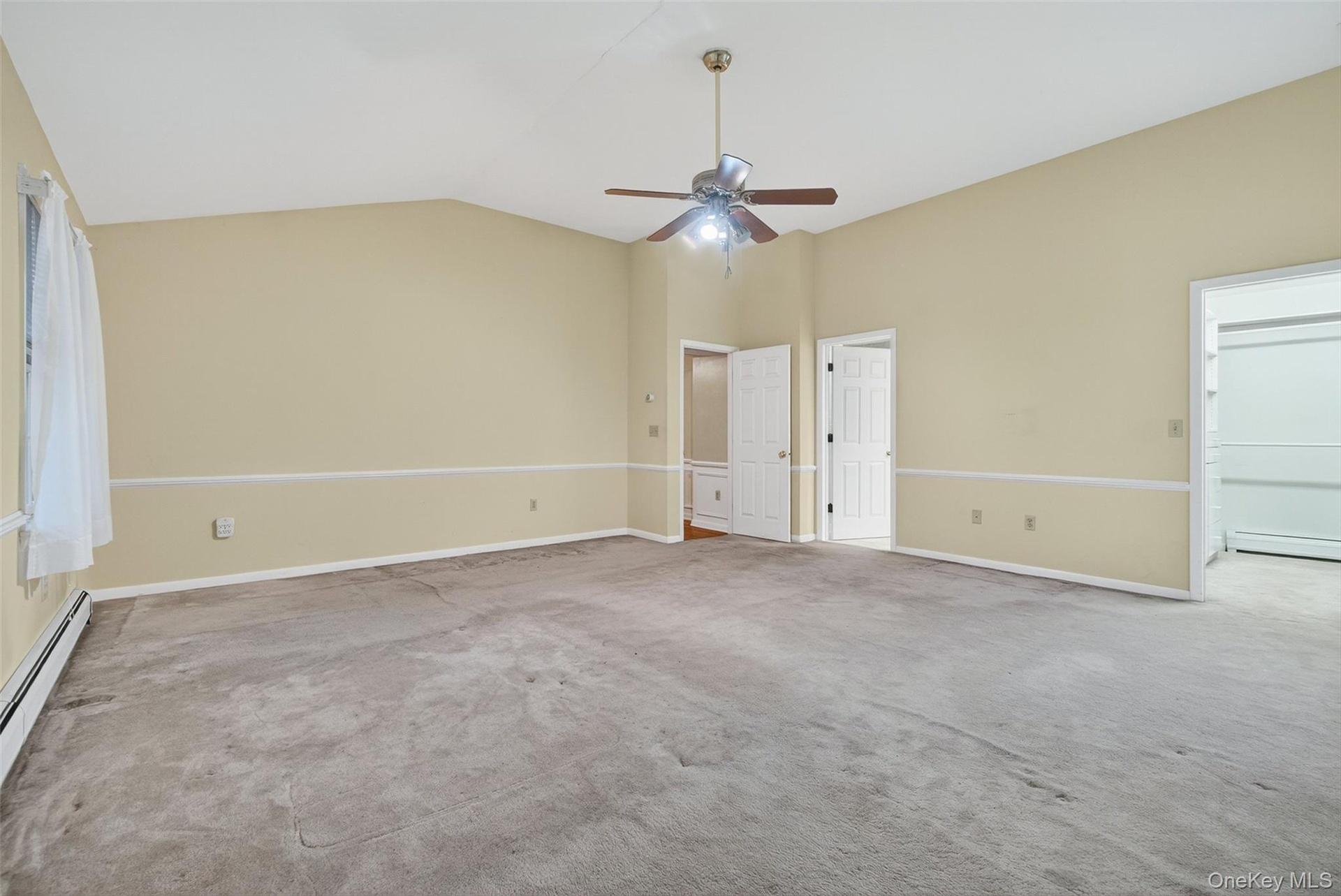 - Unfurnished bedroom with vaulted ceiling, baseboard heating, light colored carpet, a ceiling fan, and a walk in closet