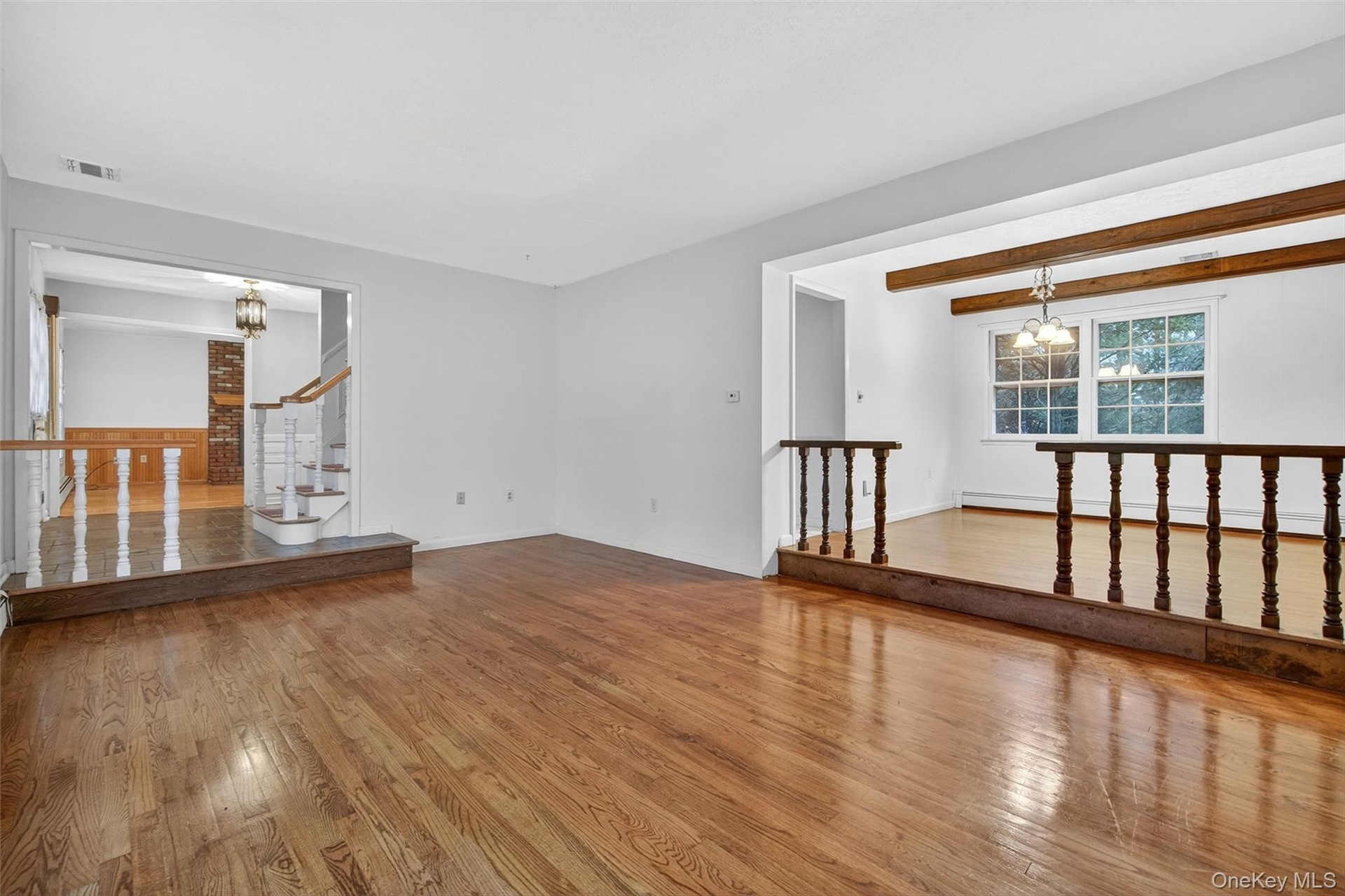 - Unfurnished room with a chandelier, wood-type flooring, beamed ceiling, and stairs
