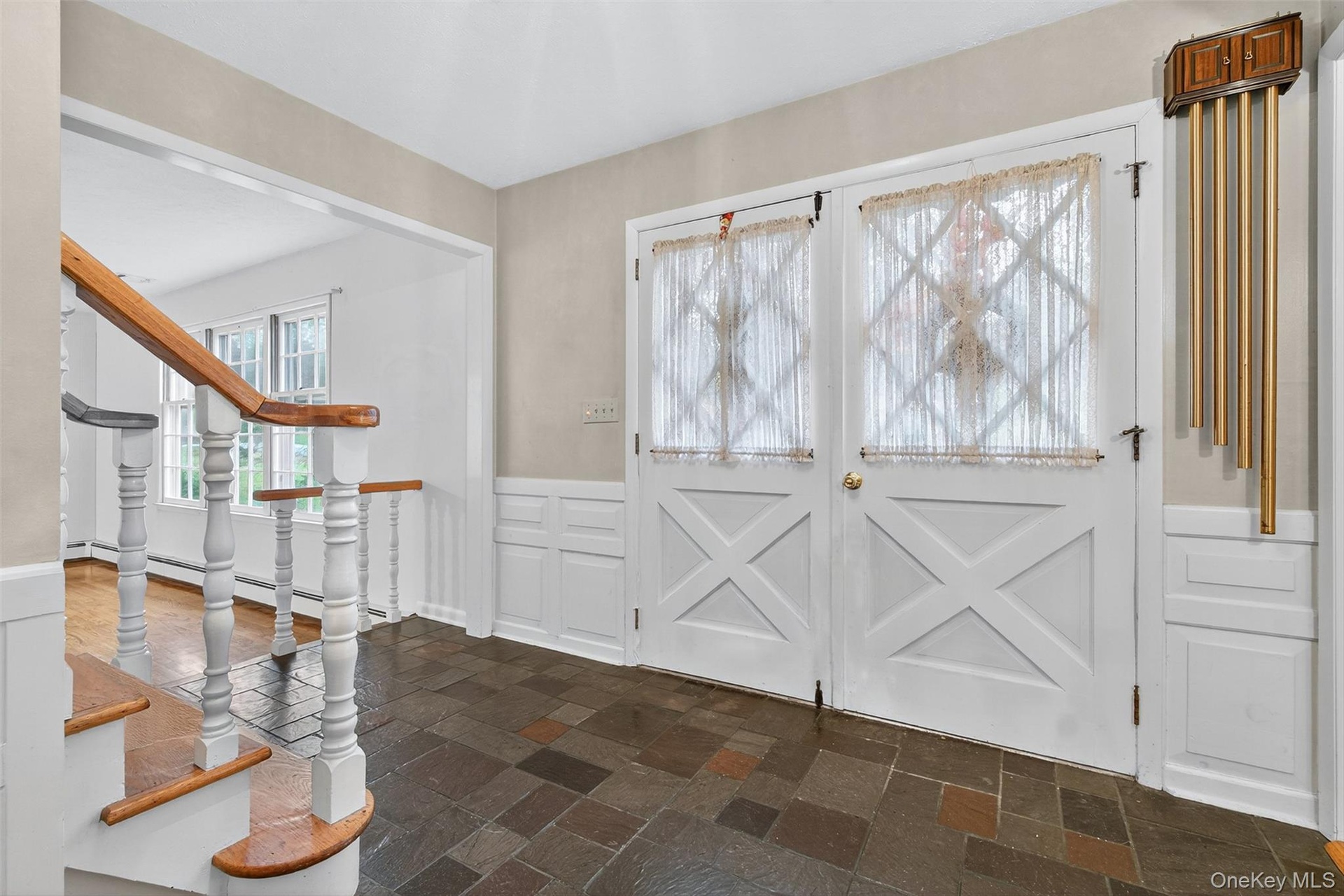 - Foyer entrance with stairway, a wainscoted wall, stone tile flooring, a decorative wall, and baseboard heating