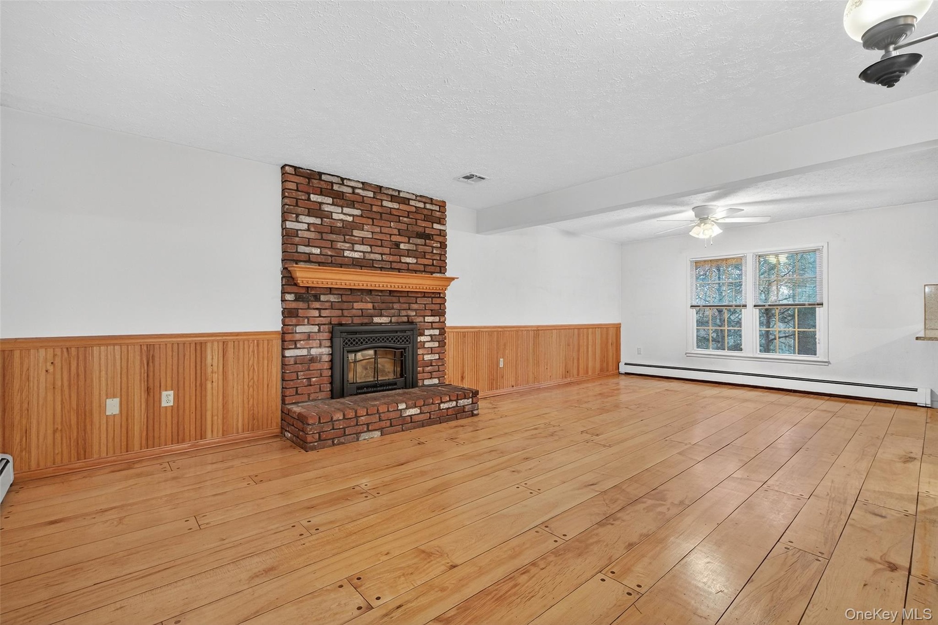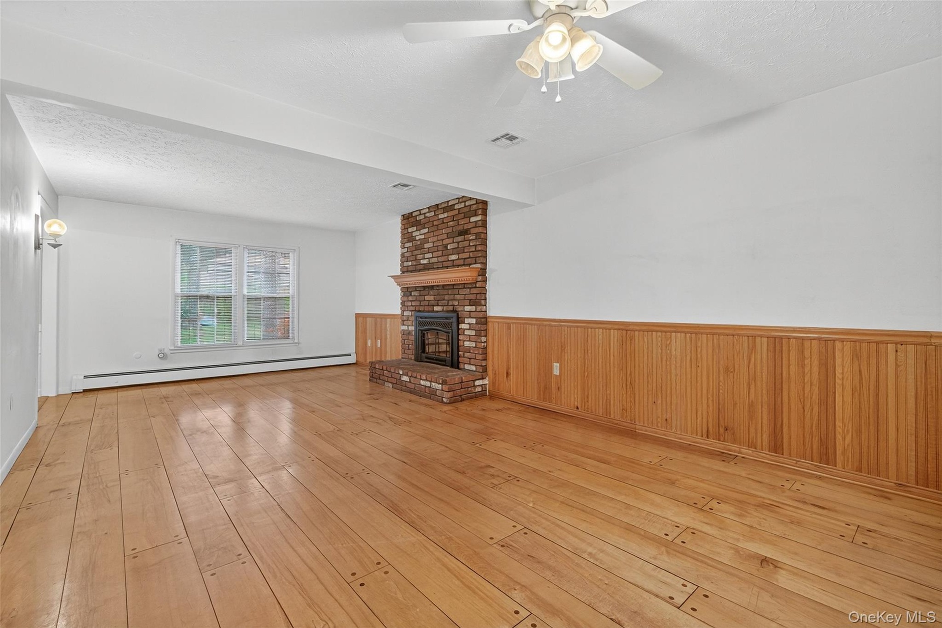 - Unfurnished living room with hardwood / wood-style flooring, a fireplace, a baseboard heating unit, a textured ceiling, and ceiling fan