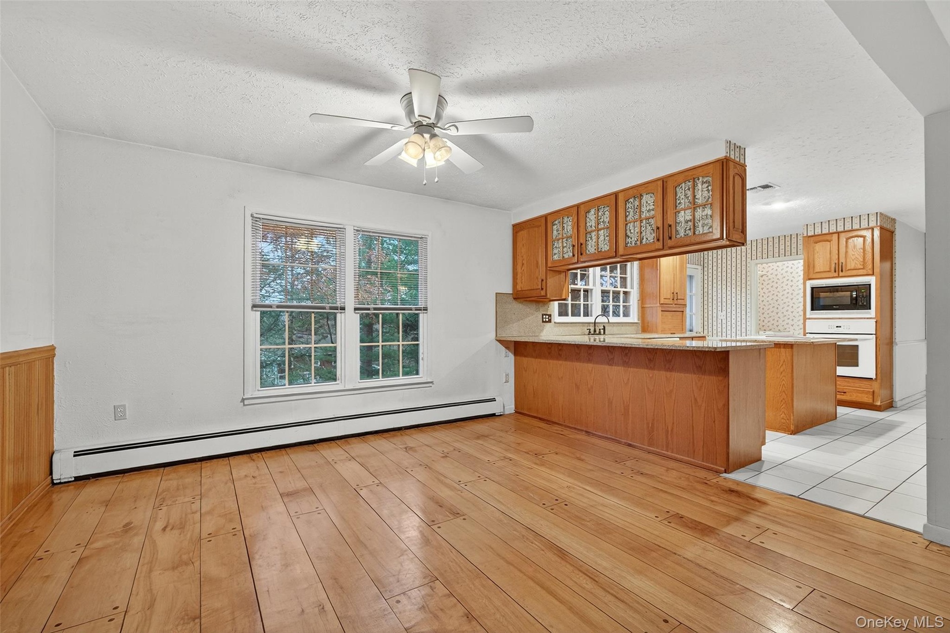 - Kitchen with a baseboard heating unit, a textured ceiling, white oven, a peninsula, and light wood-type flooring