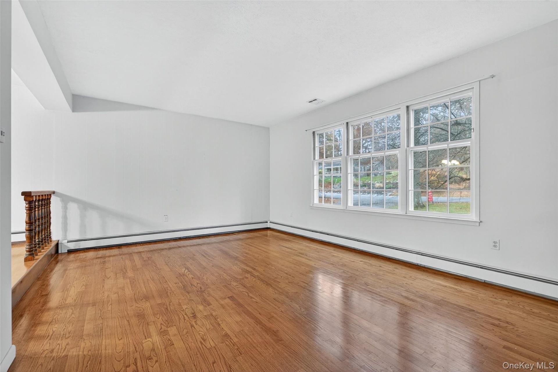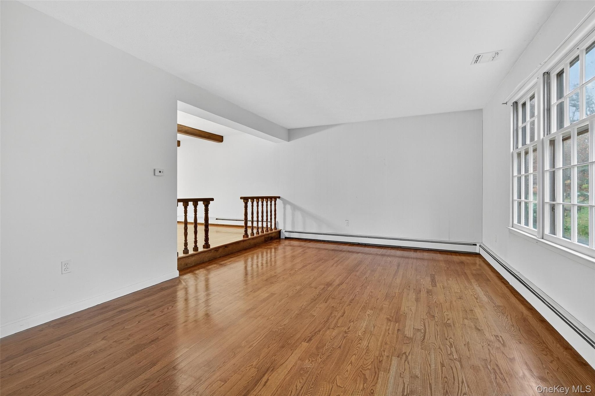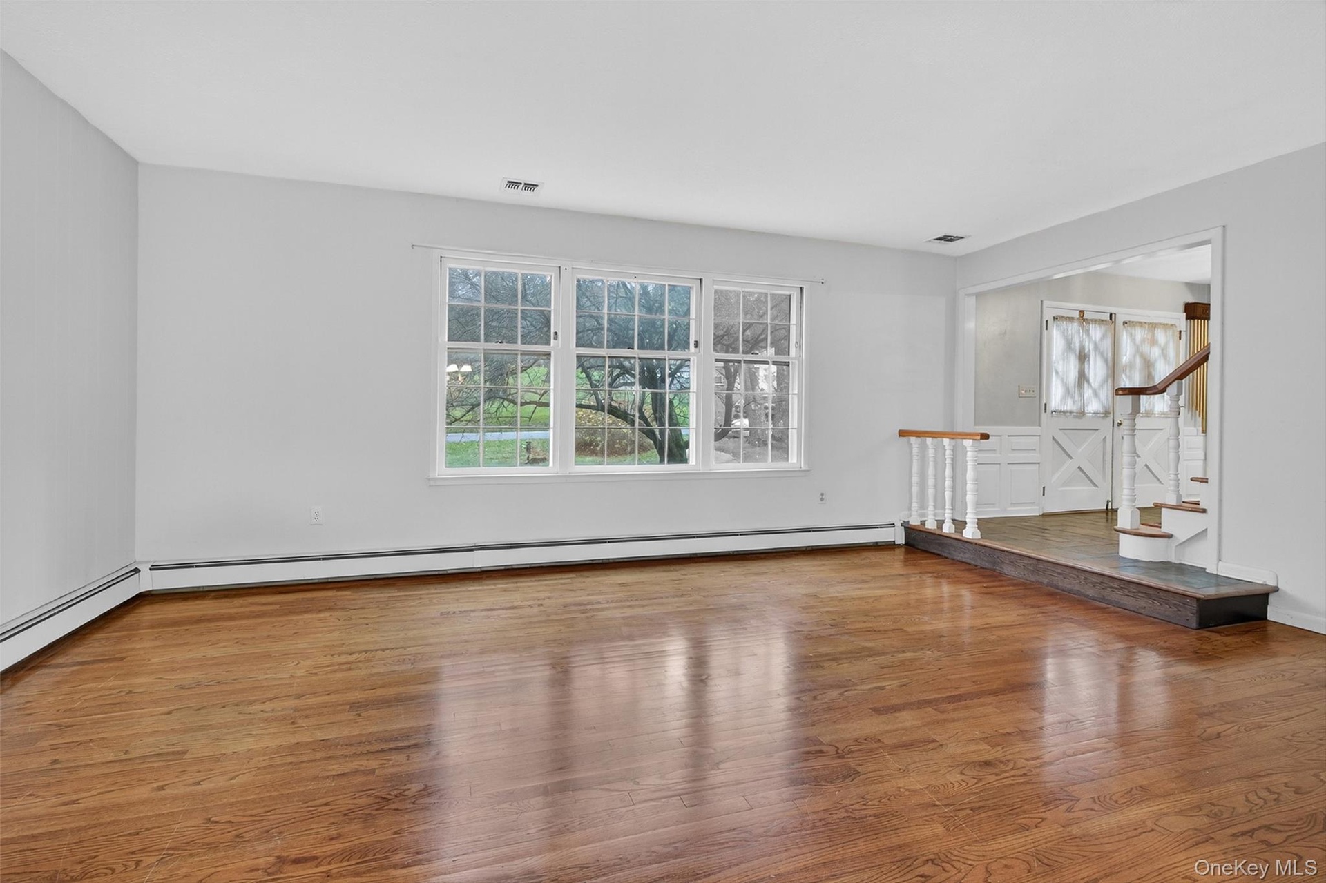 - Unfurnished living room with light wood finished floors, stairway, a baseboard heating unit, and a textured ceiling