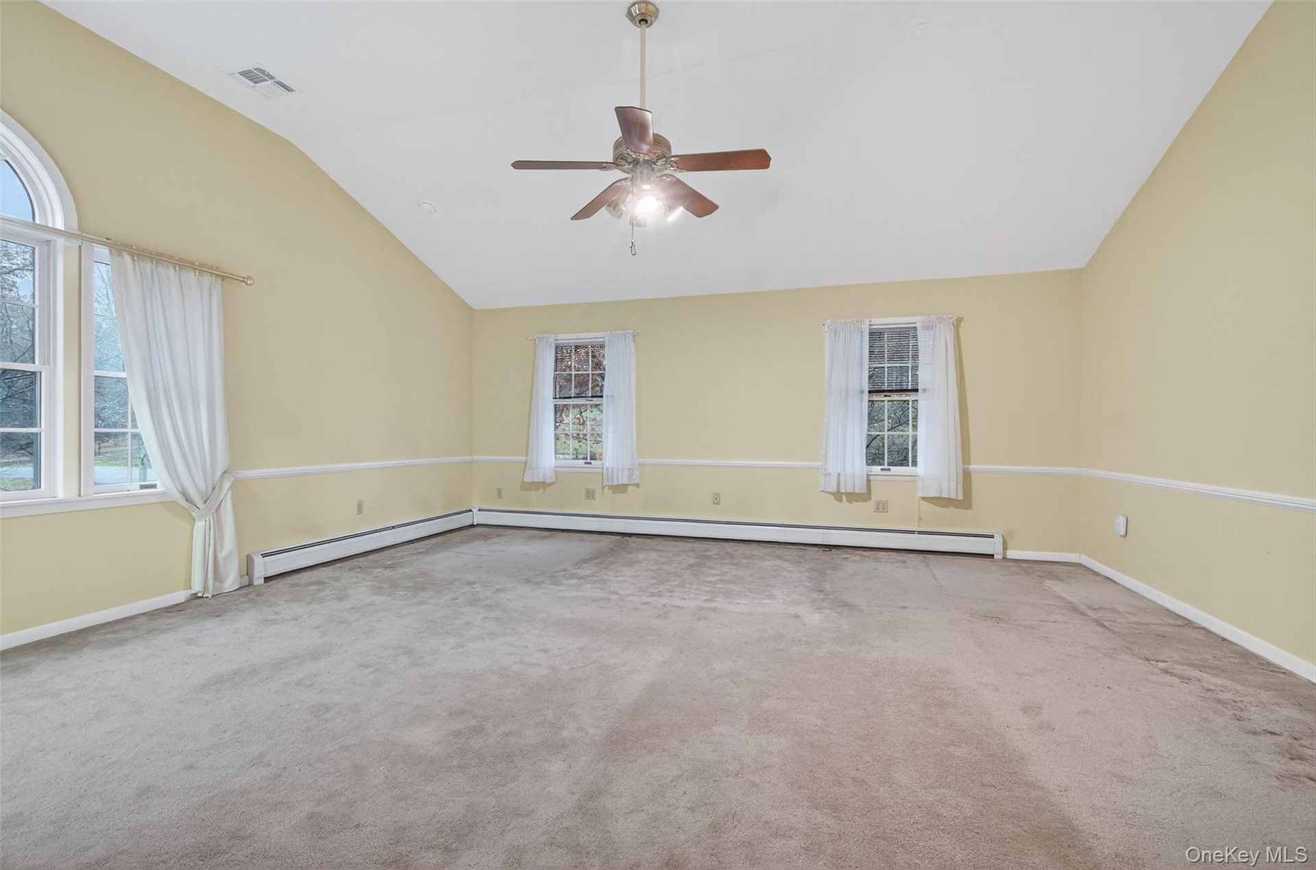 - Carpeted spare room featuring vaulted ceiling, a ceiling fan, and baseboard heating