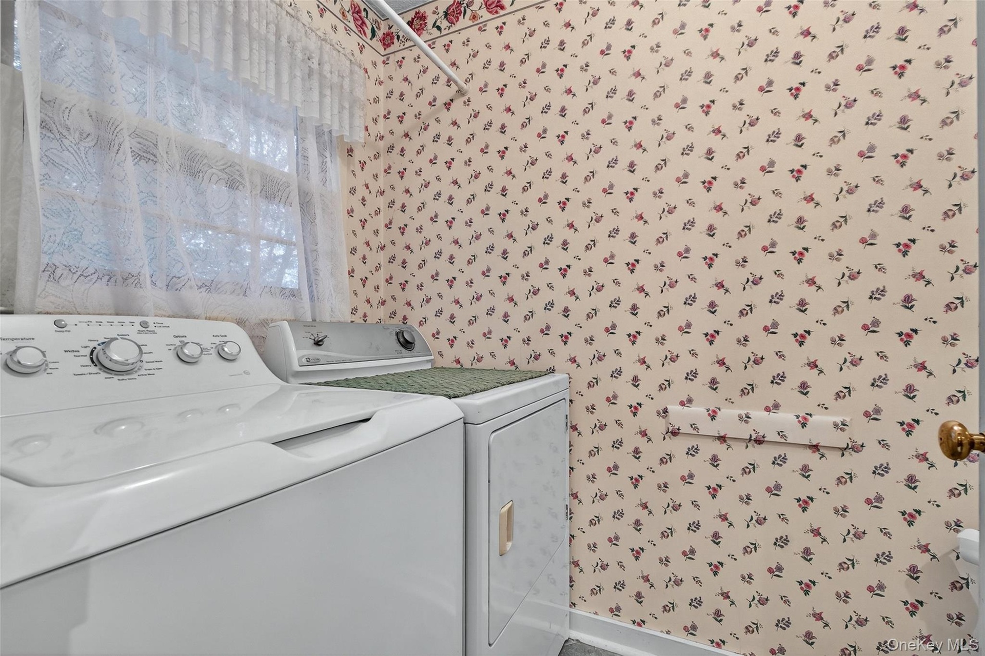 - Laundry room with wallpapered walls and washer and clothes dryer