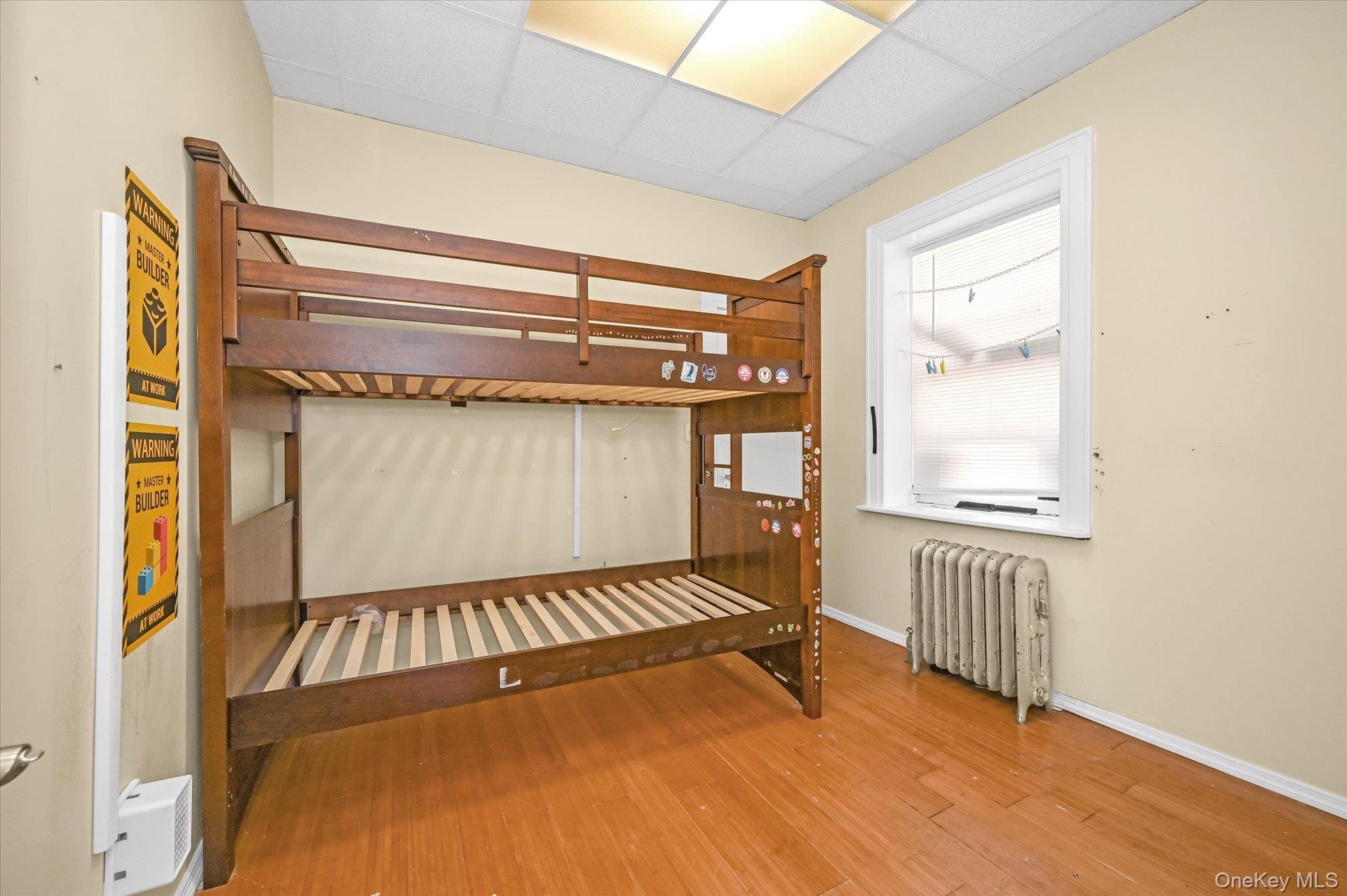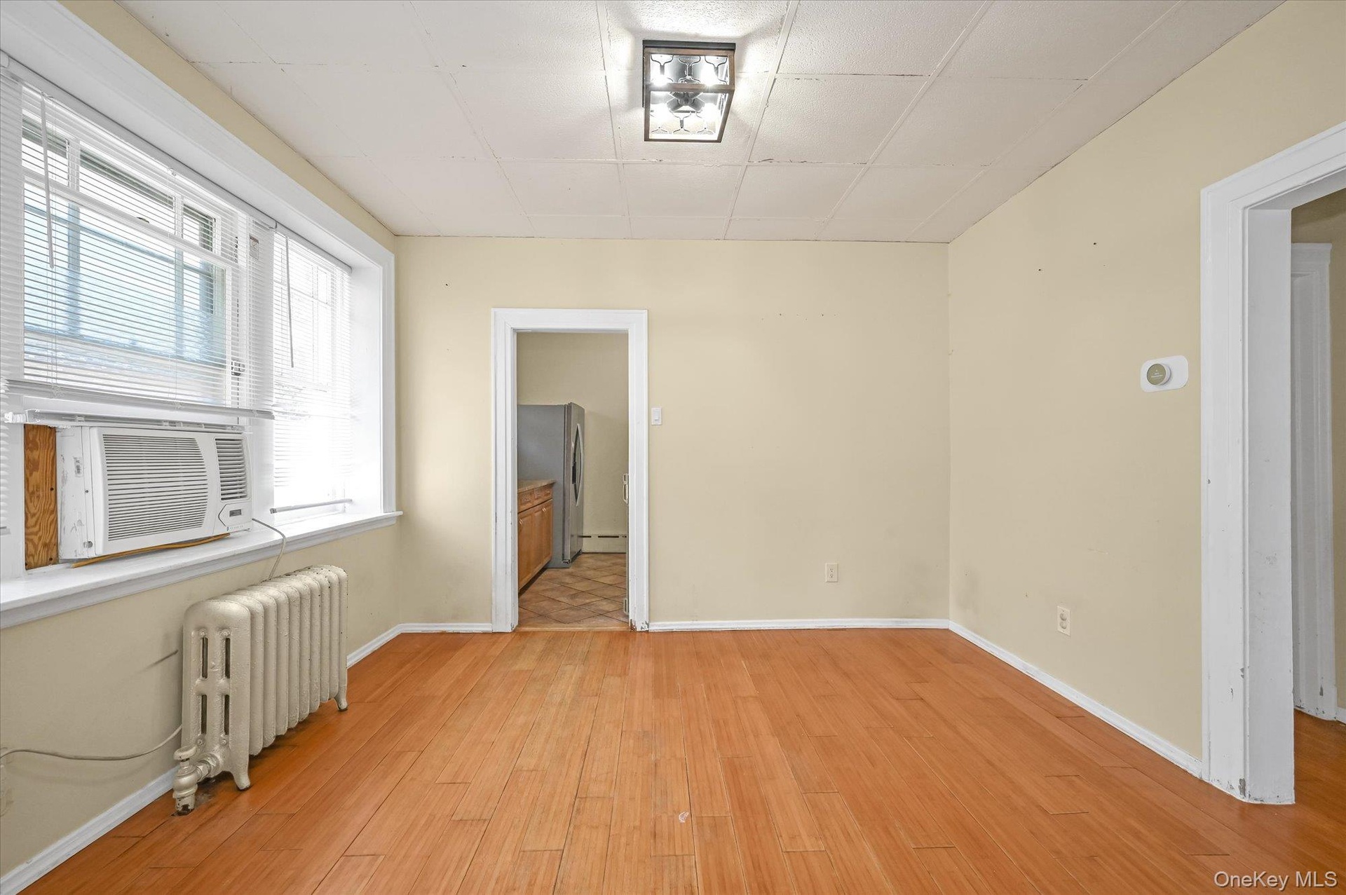 - Unfurnished bedroom with radiator heating unit, a paneled ceiling, and light wood-type flooring