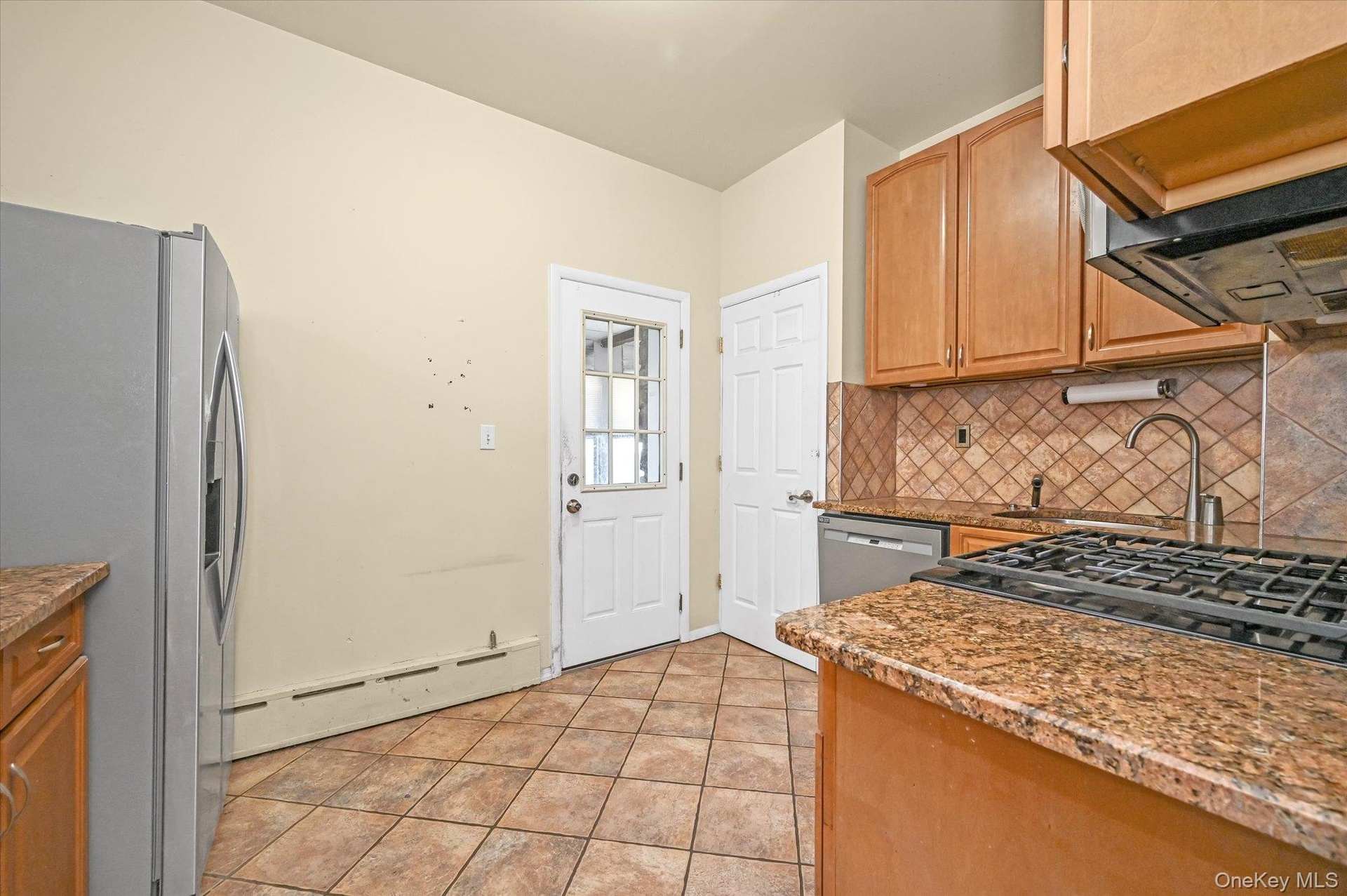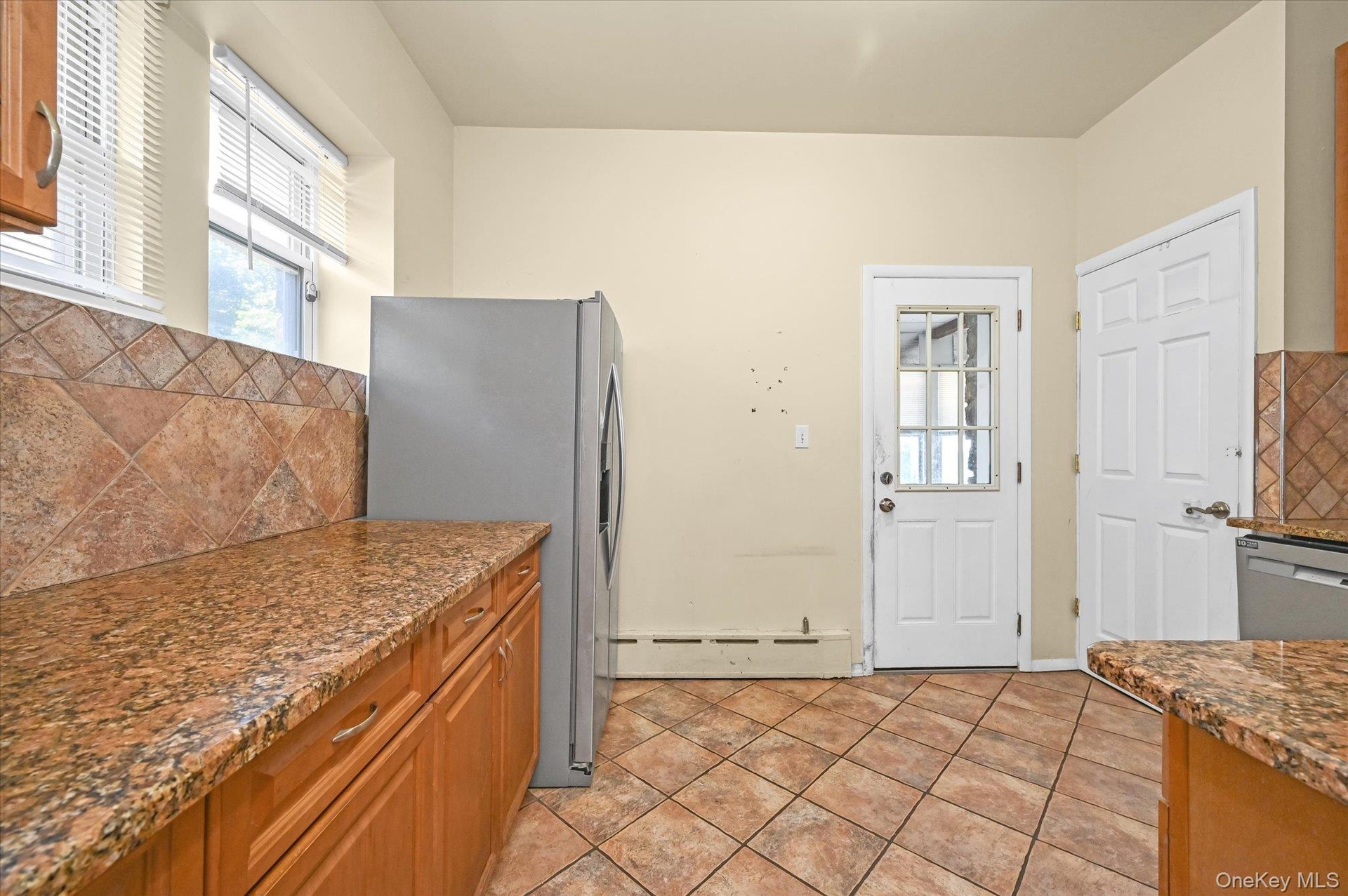 - Kitchen with stainless steel fridge with ice dispenser, baseboard heating, brown cabinetry, light tile patterned flooring, and tasteful backsplash
