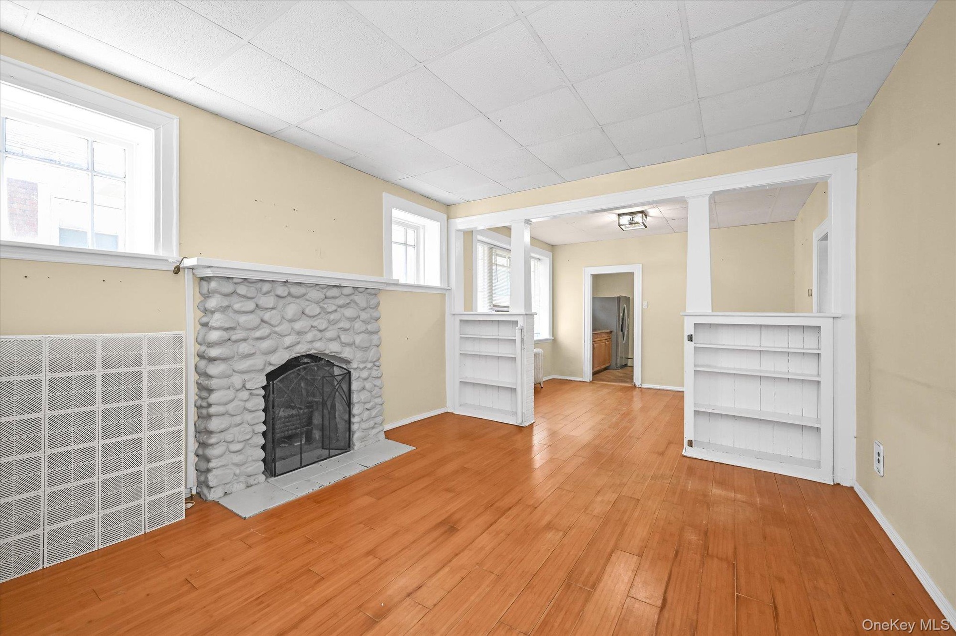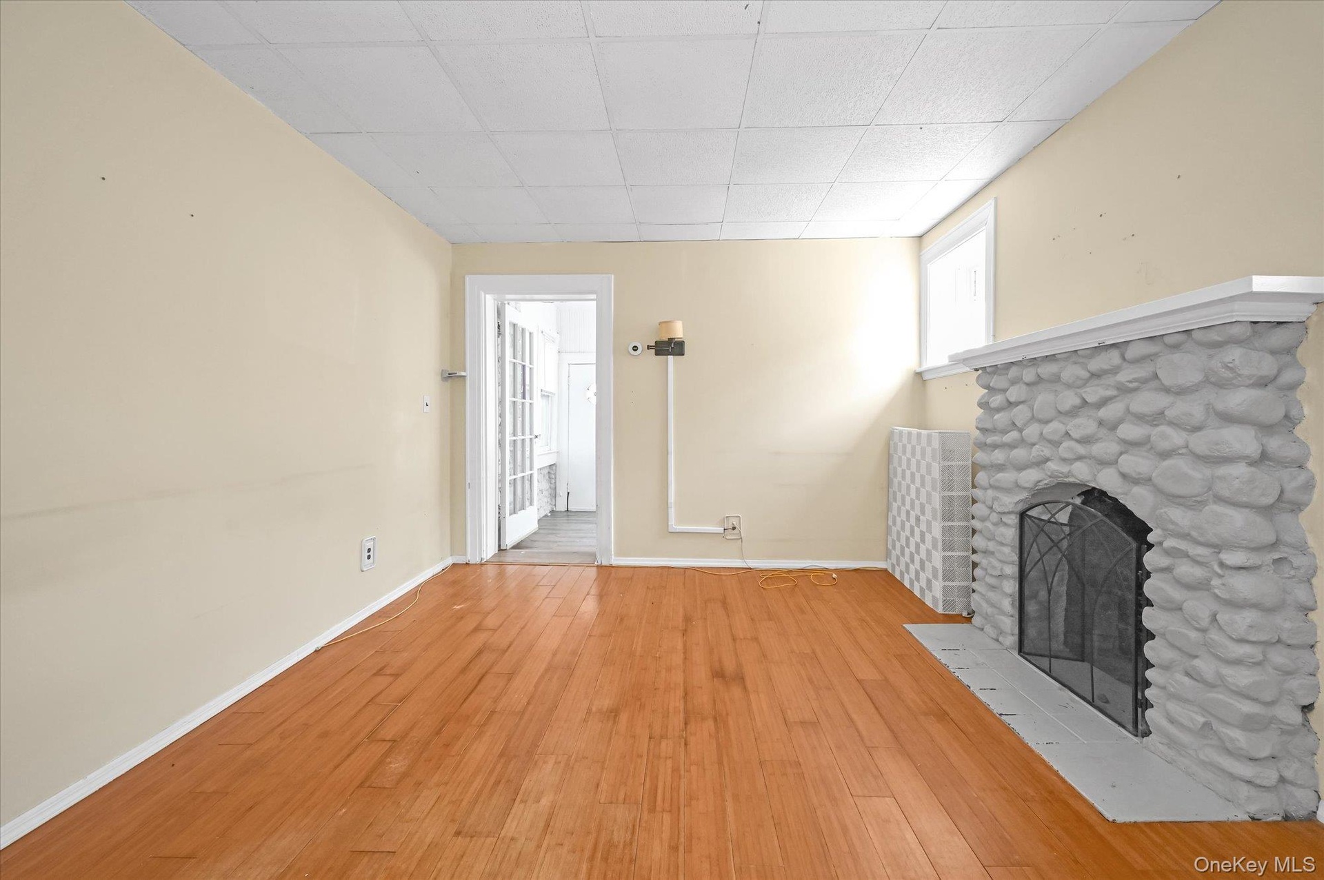 - Unfurnished living room with a drop ceiling, a fireplace, and wood finished floors