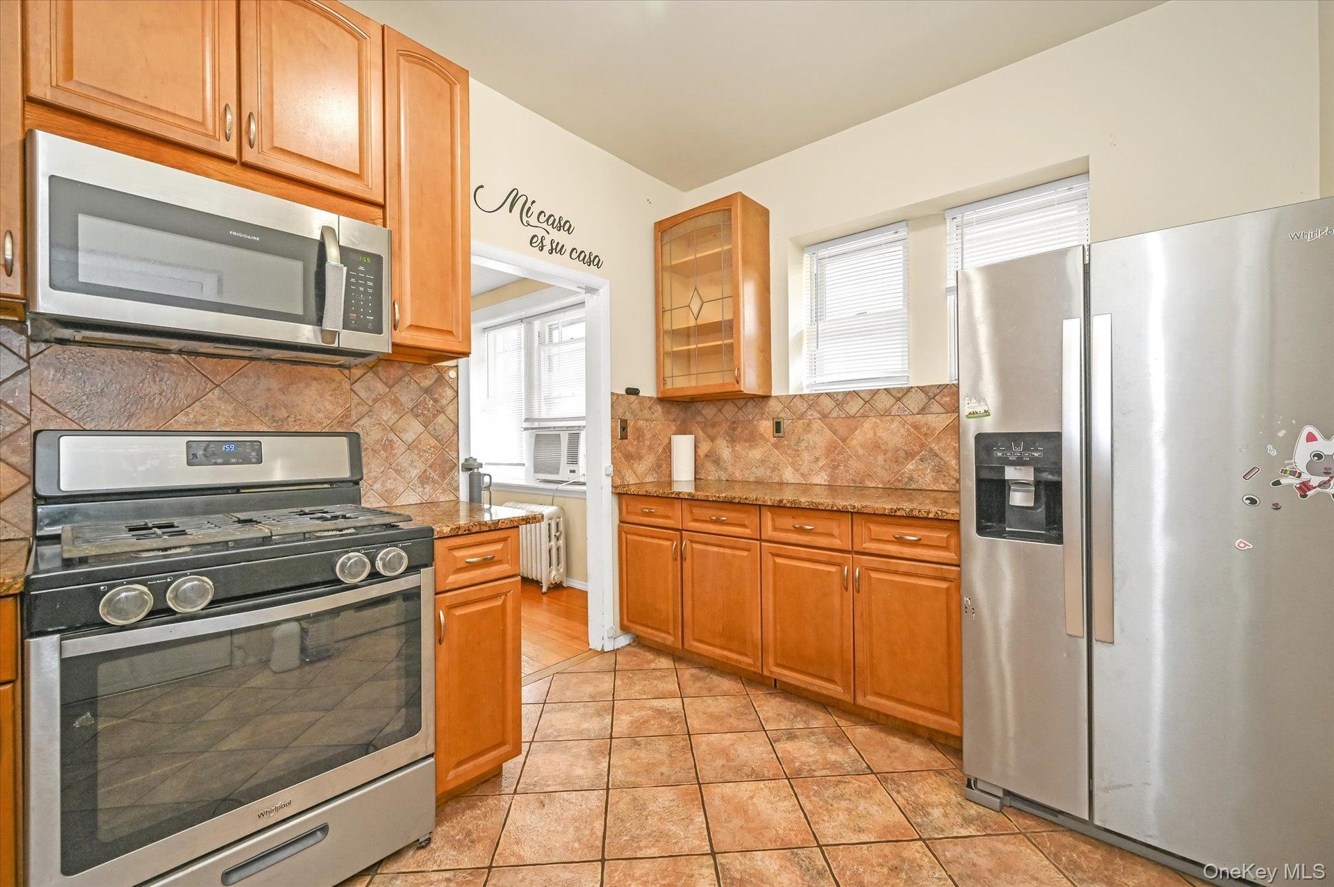 - Kitchen with appliances with stainless steel finishes, light stone countertops, glass insert cabinets, decorative backsplash, and light tile patterned