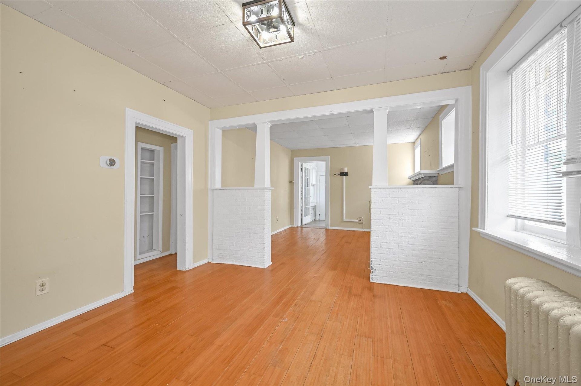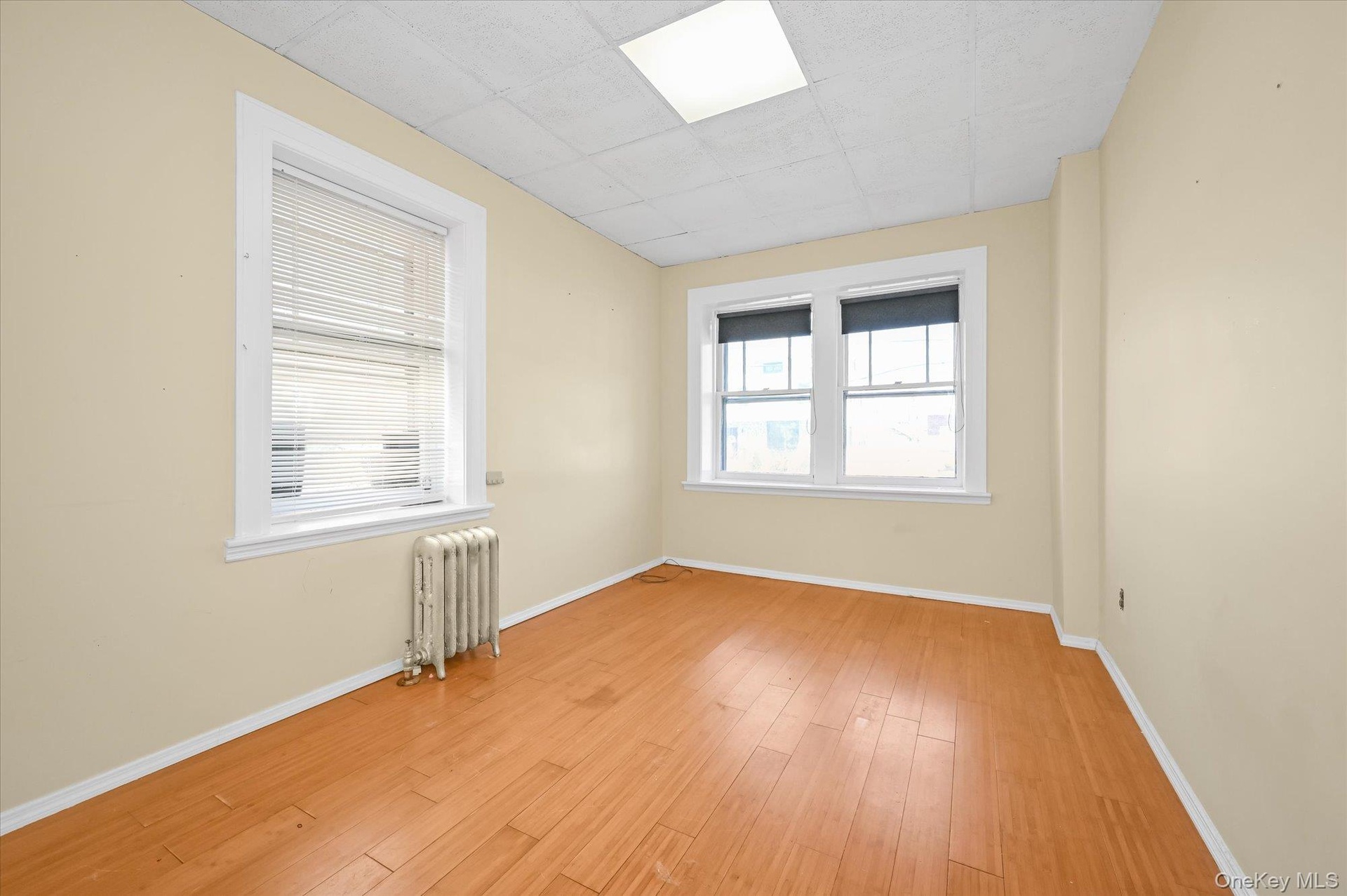 - Unfurnished room featuring radiator heating unit, light wood-style flooring, and a drop ceiling