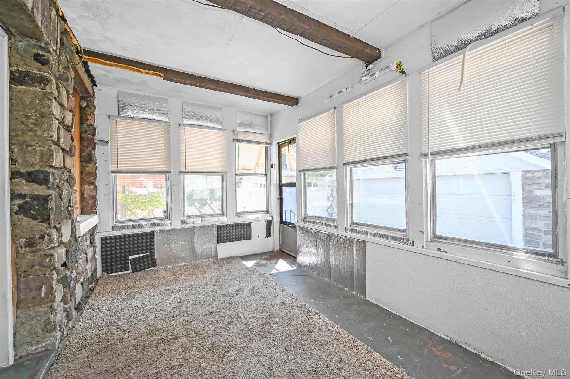 - Carpeted empty room with beam ceiling and radiator