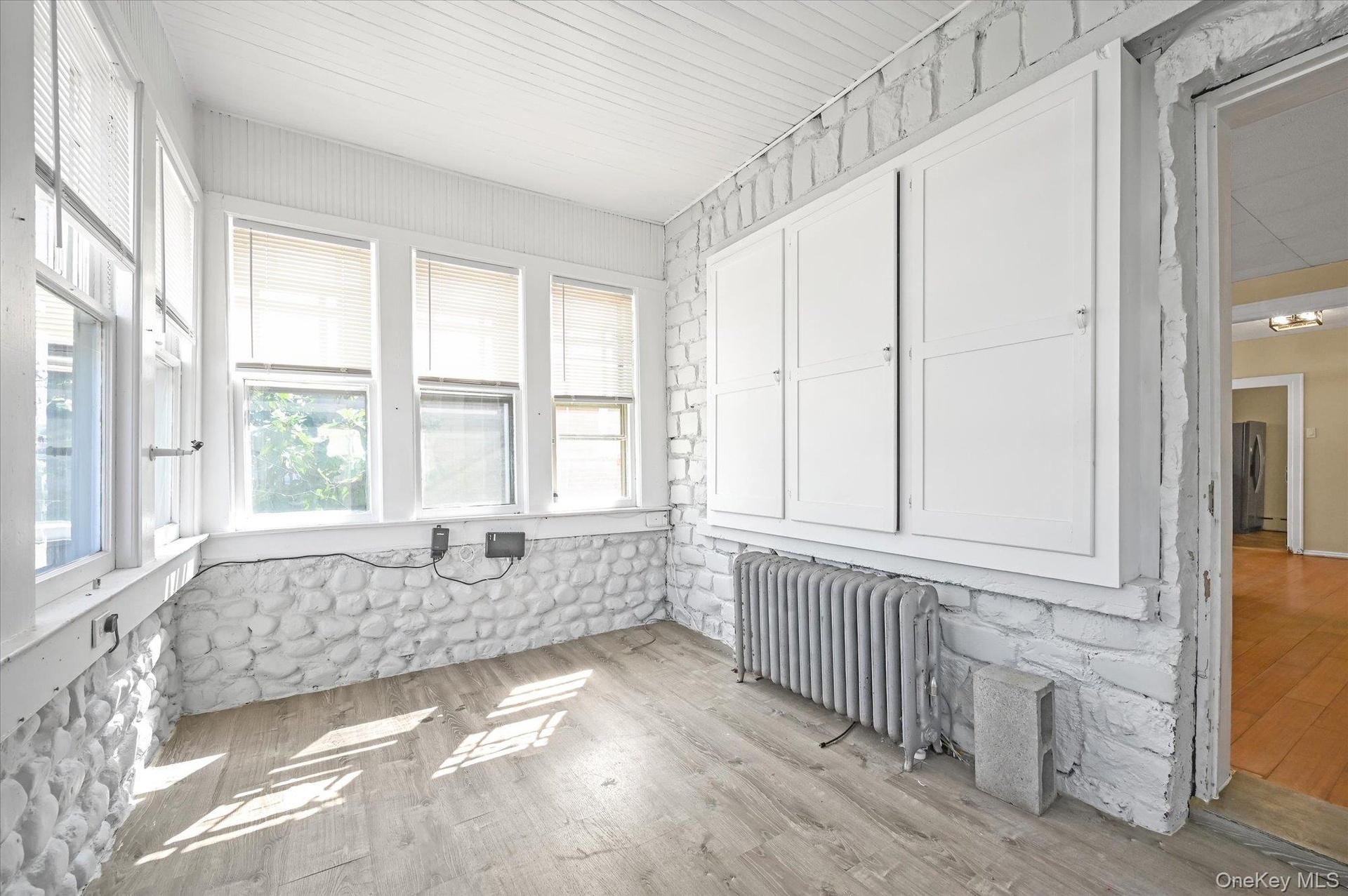 - Unfurnished sunroom featuring wood finished floors and radiator