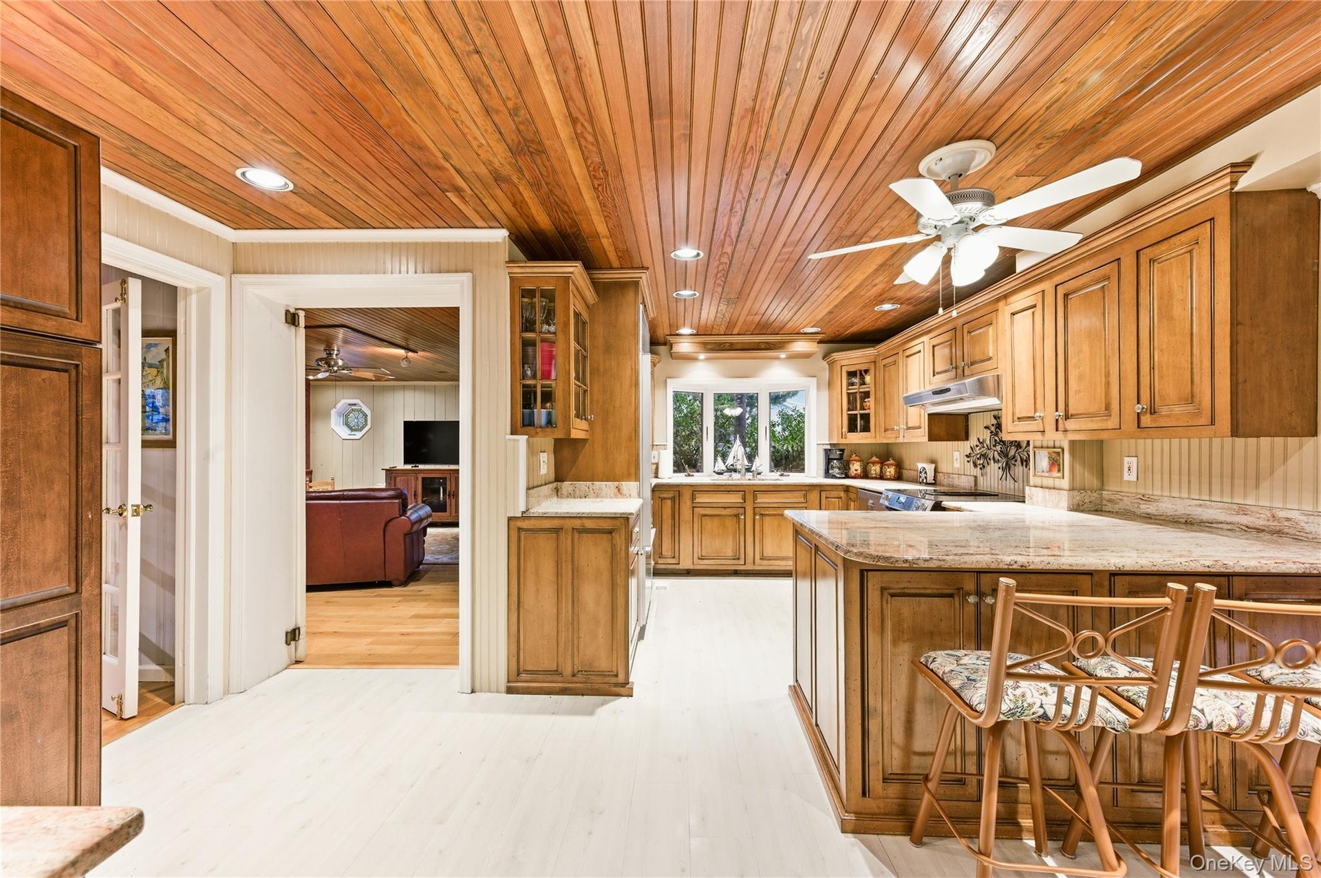 - Kitchen with ceiling fan, a peninsula, light stone counters, brown cabinetry, and wood ceiling