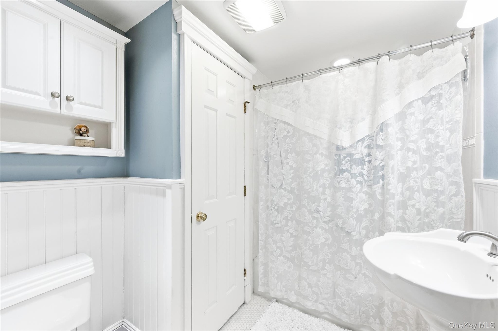 - Bathroom featuring a shower with shower curtain and a wainscoted wall