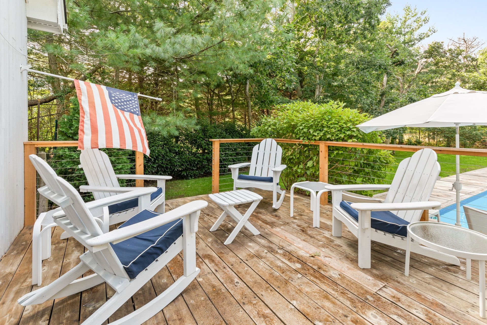 Enter a lovely home, enjoy the flow throughout with Powder Room by entry, wonderful, sunny kitchen, countertop Island with bar close to dining room table. Living room tastefully designed with skylights, brick Fireplace. Sliders lead out to deck with room to sit, sun and entertain with Weber grill. Spacious backyard with pool, pool house and shower. One Master Bedroom on First Floor with fresh ensuite bath, Jacuzzi tub and large shower with double sink vanity. Second Floor sun- filled Master Bedroom with ensuite Bath and Guest Bedroom with ensuite Bath. Lovely touches with TV in each room. Lower level/Finished Basement houses Washer/Dryer. Large Screen TV, Pool Table, Room for Exercise with Ecliptic/Treadmill, Couches and Chairs for relaxation. This is a perfect location to enjoy all the summer has to offer with beach, fresh fruits and veggies two miles and three minutes away. Near Jitney, Shops and Restaurants.