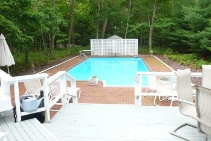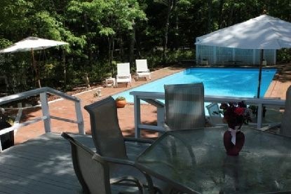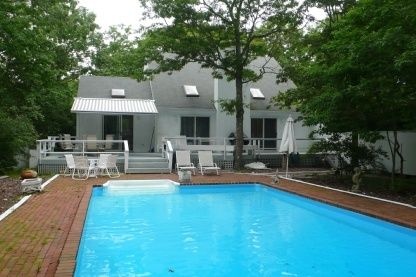 Light and bright describes this home which has a lovely living area with vaulted ceilings, sky lights, and a fireplace. There is a dining area in the kitchen. Upstairs are two bedrooms. Downstairs is another bedroom and the fourth is set up as a den. Additionally, there is one full bath upstairs and one full bath downstairs. Outside you can entertain on the private deck which has another dining area and retractable awning for your comfort. The deck overlooks the heated pool and its lush, private yard with beautiful landscaping. You are also very close to the harbor. This is a wonderful home with everything you need to enjoy a great summer in East Hampton.