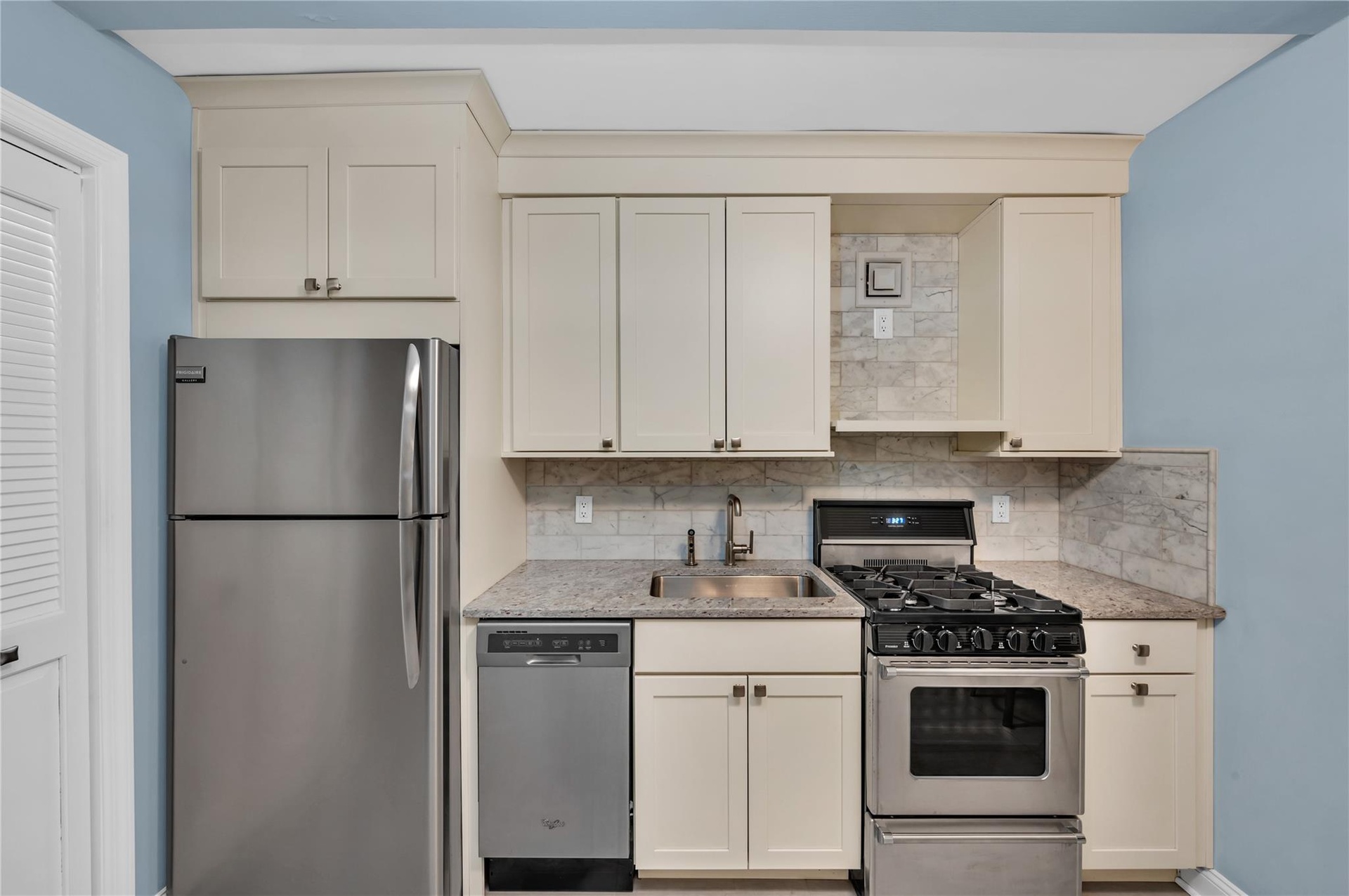 - Kitchen with stainless steel appliances, backsplash, and light stone counters